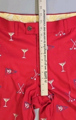 The Loudmouth Golf Shorts in size 40 feature vibrant red color with 19th Hole Flag and golf clubs and martini embroidery, making them a stylish and eye-catching choice for any golfer. Made of polyester material and designed with a zip closure, these shorts are machine washable for easy care. The flat front, slash pocket, and 11-inch inseam offer both comfort and functionality, while the brand's unique style adds a playful touch to your golf attire. Perfect for any golf enthusiast looking to show off their love for the game and a martini in style.
