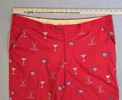 Loudmouth Golf Shorts 40 19th Hole Flag Red W/Golf Clubs And Martini Embroidery