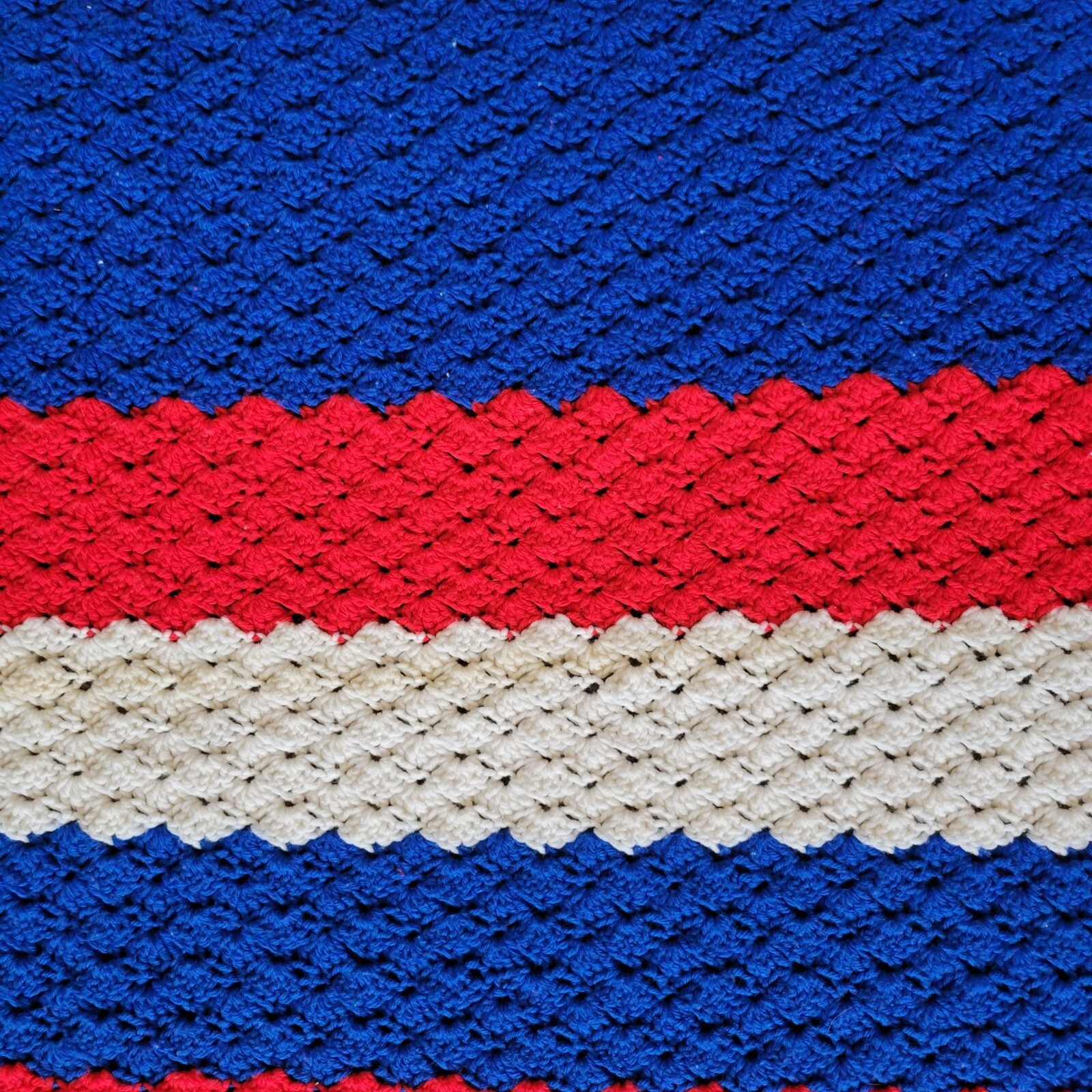 This vintage, hand-crafted crochet afghan blanket showcases a vibrant American flag design. Measuring 62"x52", it offers cozy comfort and patriotic flair, making it a timeless piece for any home decor.