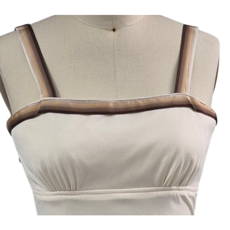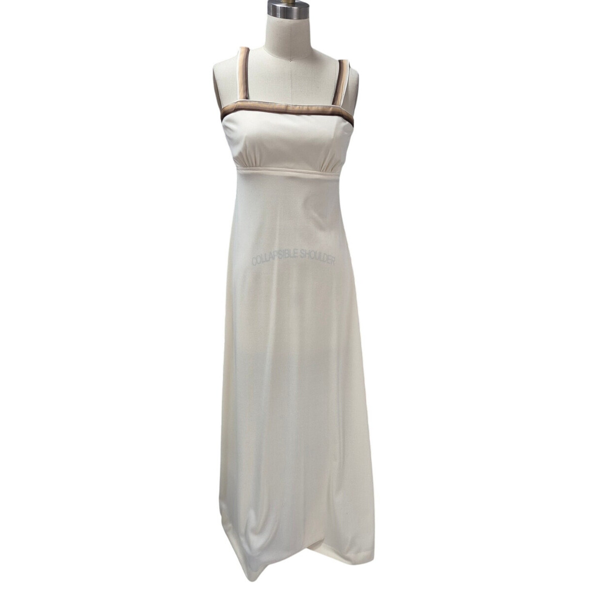 1970s VTG Cream Empire Waist Maxi Dress with Sheer Shawl/Cape and Brown Ombre Trim, Size S, featuring a zipper back and an A-line shape that can be worn with or without the sheer cape. Made entirely of weighty polyester for easy care. I love the ombre brown ribbon trim on the cape. Handcrafted at home. Has a zipper back, A-line shape, and can be worn with or without the sheer cape. All polyester for easy care. Love the ombre brown ribbon trim on the cape. Handmade at home. In excellent condition, no flaws.