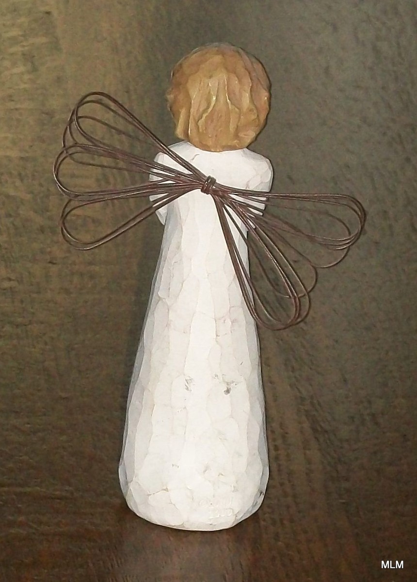 Standing angel in cream dress and wire wings, holding blue-gray bird in hand