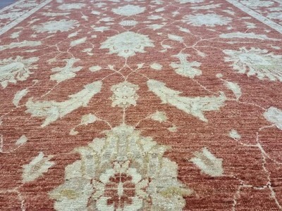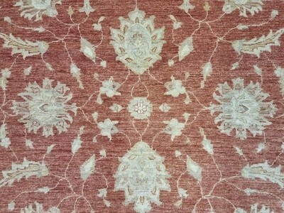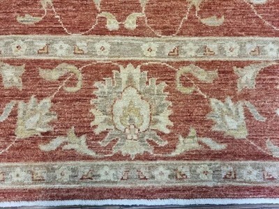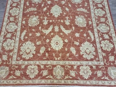 Warmth and Sophistication from Afghan CraftsmanshipThis stunning Afghan Ziegler rug, crafted in the 1980s, showcases the enduring tradition of Central Asian weaving with a design that bridges cultural heritage and contemporary elegance. The rich terracotta color palette exudes warmth and sophistication, creating an inviting atmosphere in any interior space. Classic Ziegler Design InterpretationThe rug features the distinctive Ziegler pattern characterized by its elegant, oversized floral motifs and graceful vine scrolls. This design represents a European interpretation of traditional Persian aesthetics, creating a versatile aesthetic that works equally well in both classic and modern interior settings. Exceptional Hand-Knotted ConstructionCrafted using time-honored techniques, this piece demonstrates the superior quality of hand-knotted construction. The fine wool pile on a durable cotton foundation ensures both visual beauty and practical durability, promising years of use while maintaining its structural integrity and luxurious texture. Rich Terracotta Color HarmonyThe warm terracotta tones create a harmonious background for the intricate patterning. Subtle variations in the reddish-brown hues add depth and character to the overall composition, while accent colors of ivory, sage green, and navy blue provide contrast and visual interest throughout the design. Substantial Yet Versatile PresenceWith dimensions of 6.6' by 9.2', this rug commands attention while remaining adaptable to various room configurations. Its substantial size makes it ideal for anchoring living room furniture arrangements, defining dining areas, or adding luxury to master bedroom spaces. Key Product DetailsStyle Afghan ZiglerPeriod Late 20th Century, circa 1980sOrigin AfghanistanCondition Excellent Vintage ConditionMaterial Hand-Knotted Wool on Cotton FoundationDimensions 6 ft 6 in x 9 ft 2 inDimensions (Metric) 200 cm x 282 cmPrimary Colors Terracotta, Ivory, Sage Green, Navy Blue