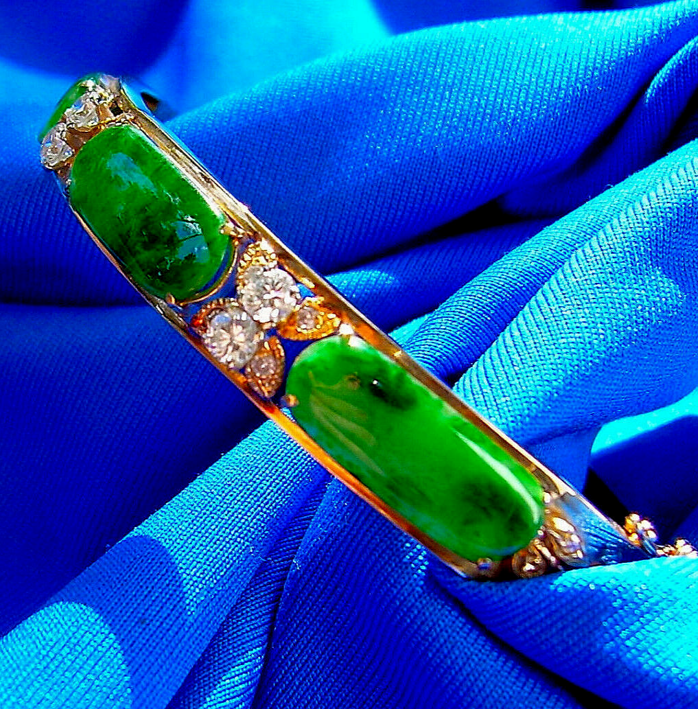Earth mined Imperial Jadeite Jade Diamond Antique Deco Bangle Bracelet 18k Gold