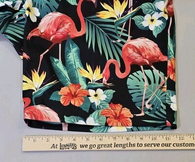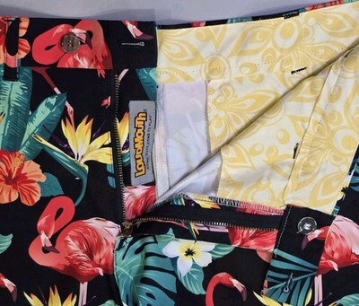 This product is a pair of Loudmouth Golf shorts for men in size 40, featuring a vibrant pink flamingo tropical design on a black background. Made of 100% polyester, these athletic shorts have a zip closure and a 10-inch inseam, making them perfect for golfing or outdoor activities in the summer, fall, or spring. The multicolor floral pattern adds a touch of nature and designer flair, making them a stylish choice for men looking for colorful and unique activewear options. The brand Loudmouth Golf is known for its quality and attention to detail, making these shorts a great addition to any wardrobe.