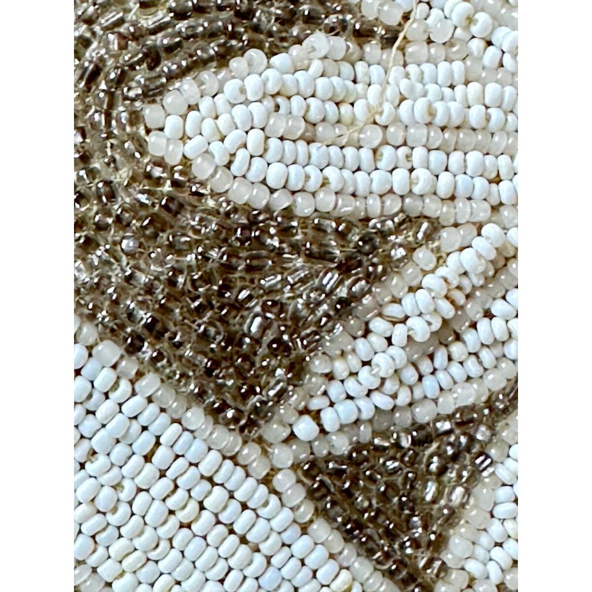 Retro vtg Purse Small Seed Bead Clutch Bag Deco 1930S Czechoslovakia; White dainty little seed bead purse of silver and white beads formed into an Art Deco pattern on the front, with the back being plain white beads. It has a zipper top and a white taffeta lining. There is no label, though it looks like other Czechoslovakian beaded bags I have come across. It has a dance strap on the back. The zipper says maiden Czechoslovakia.