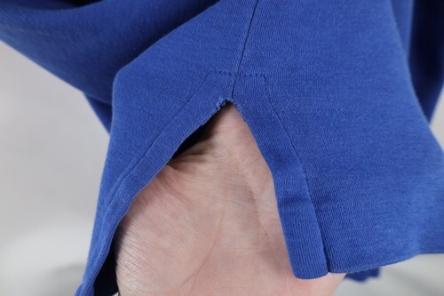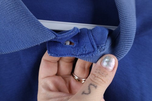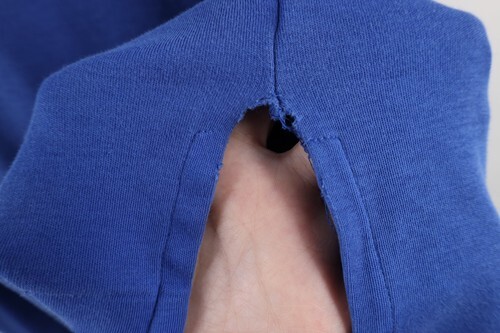 Holes and stains both armpits, collar. Side slits ripped. Collar and arms discolored. Color faded