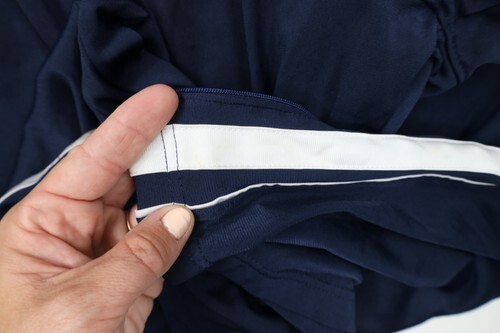 Dark spots throughout. Cuffs discolored. Pilling, fabric pulls. String, logo distressed