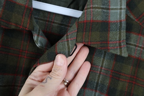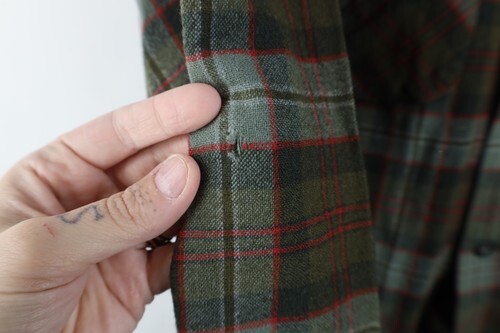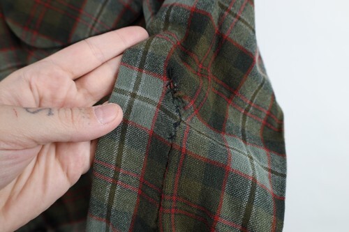Hole right sleeve, mended hole left sleeve. Missing bottom button. Left pocket ripped. Blemishes front middle. Collar, cuffs discolored. Color faded. Pilling. USA mae