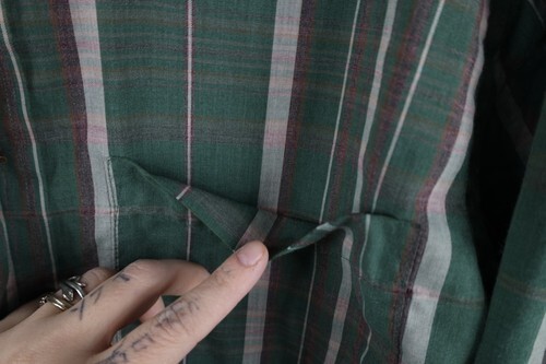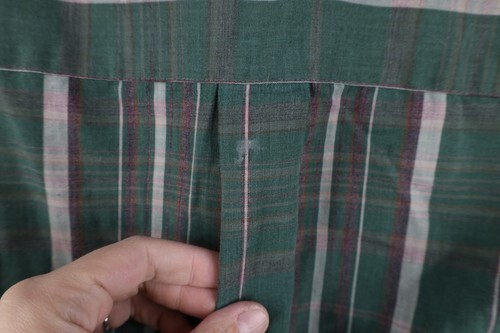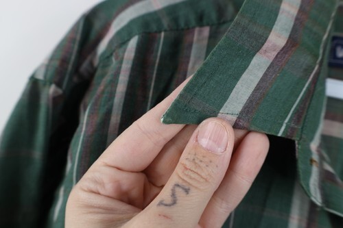 Stain back top. Holes collar tips. Collar, cuffs, pocket discolored. Color faded. Pilling