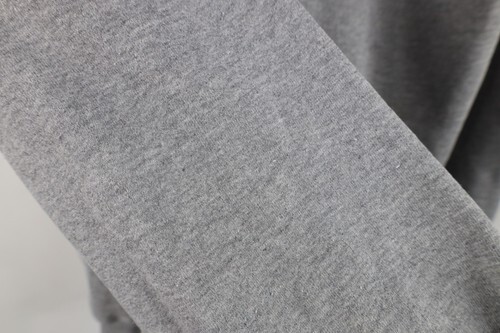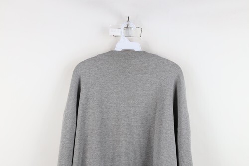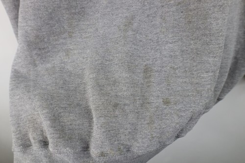 Stains/dark spots throughout. Collar, cuffs discolored. Collar stretched. Color faded. Pilling. Made in USA