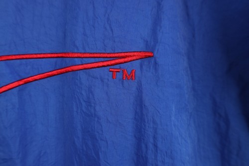 Blemish, loose thread front. Inner lining discolored, pilled. Collar, cuffs discolored. Logos distressed. Color faded