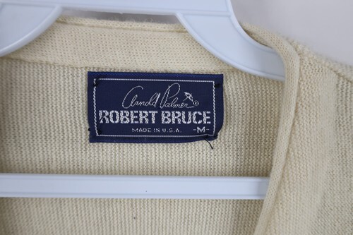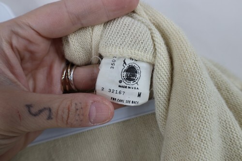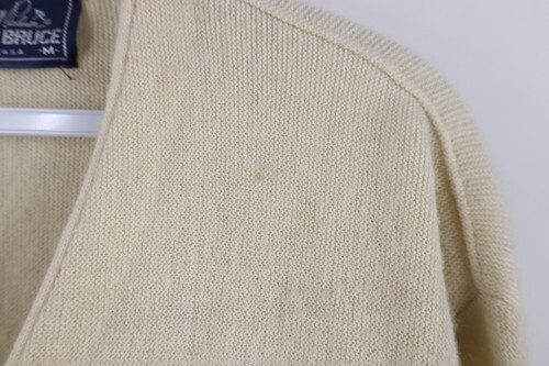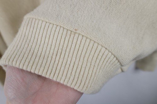 Stains front, right arm. Color faded. Pilling. Cuffs discolored. Made in USA