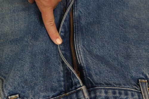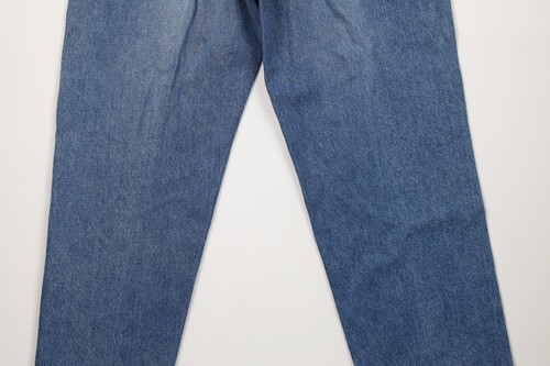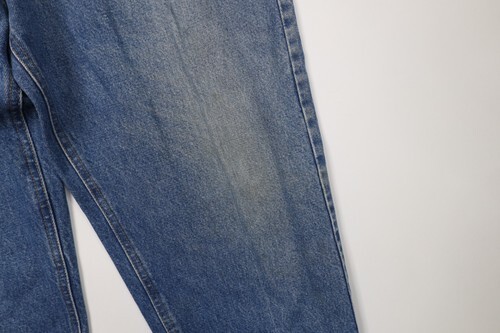 Thread bare/discoloring front, fly, pockets. Blemishes front of legs, back of legs, pockets. Discoloring throughout, and cuffs. Distressed and faded