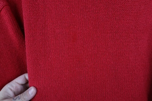 Dark spots front, stains right arm. Fabric pulls/holes left arm. Collar, cuffs discolored. Color faded. Pilling. Loose threads tag