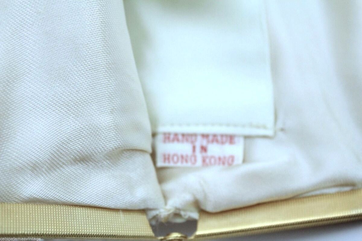 Handmade in Hong Kong, 6 oe? x 7? ivory satin vintage evening bag of seed pearls and aurora borealis sequins. It has a white taffeta lining with one pocket and a 24? goldtone chain strap, frame, and closure. Aside from a couple of loose/missing sequins as shown, it is in excellent condition and would make a perfect wedding bag.