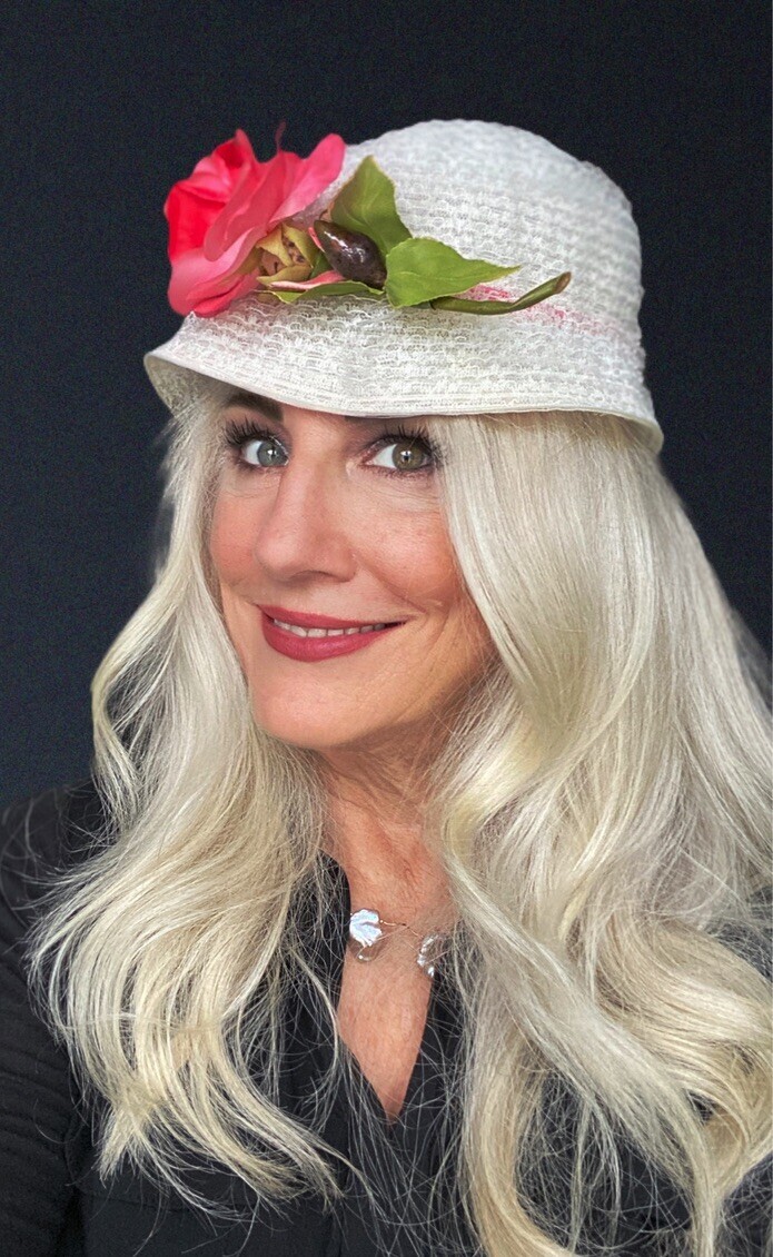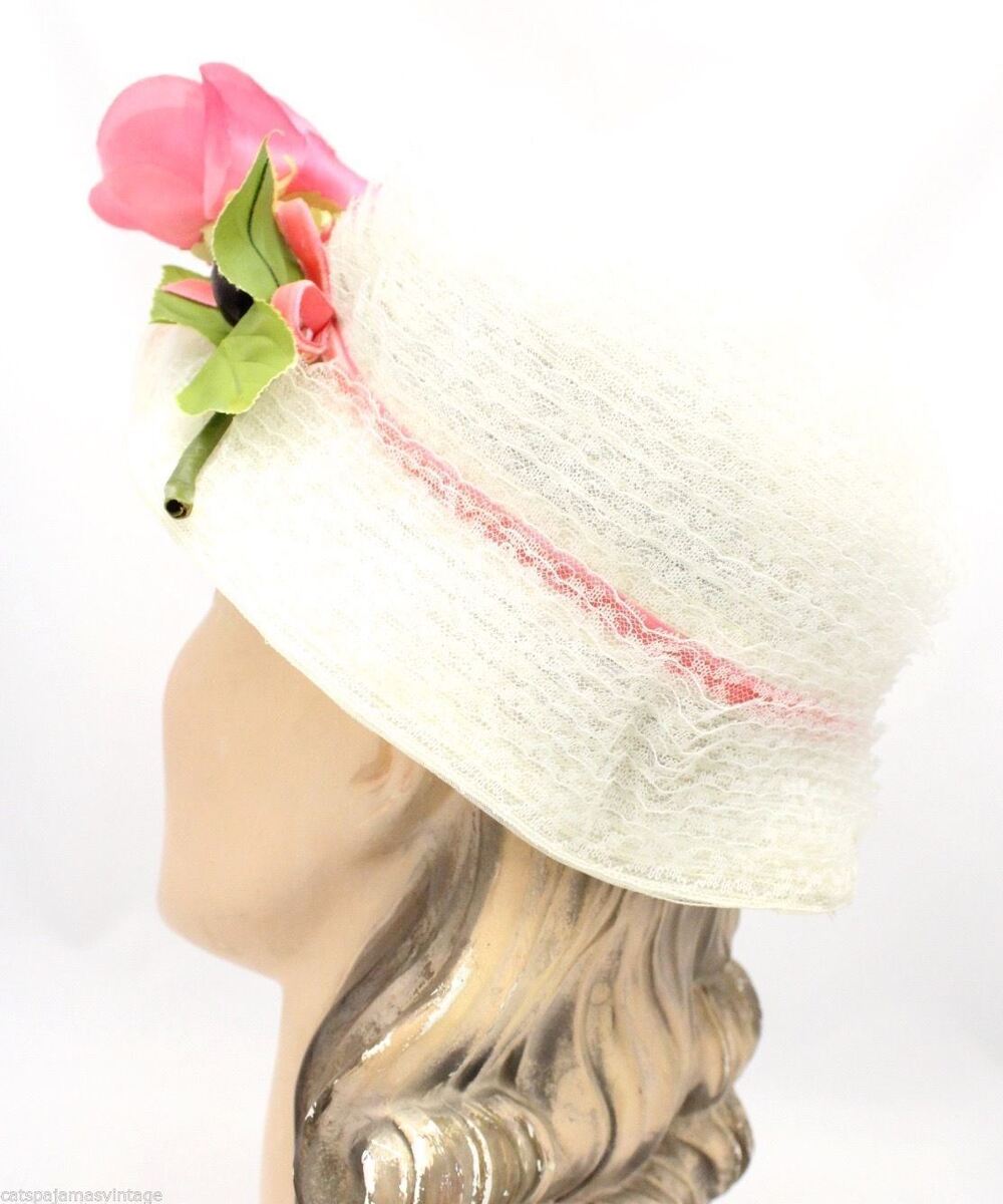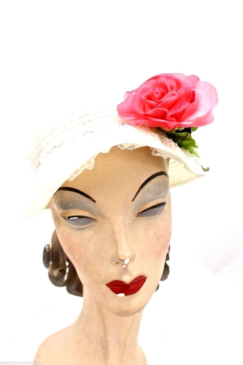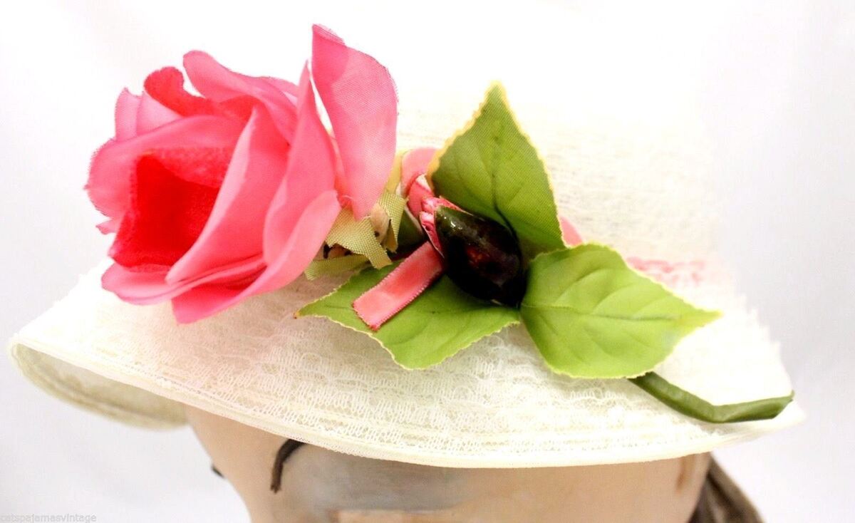 James Campbell VTG Ladies Hat White Lace w Pink Rose 1950s OS Garden Party