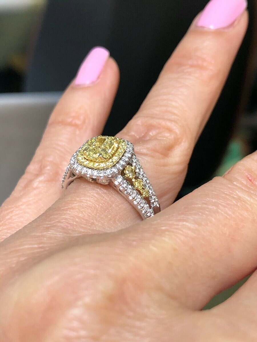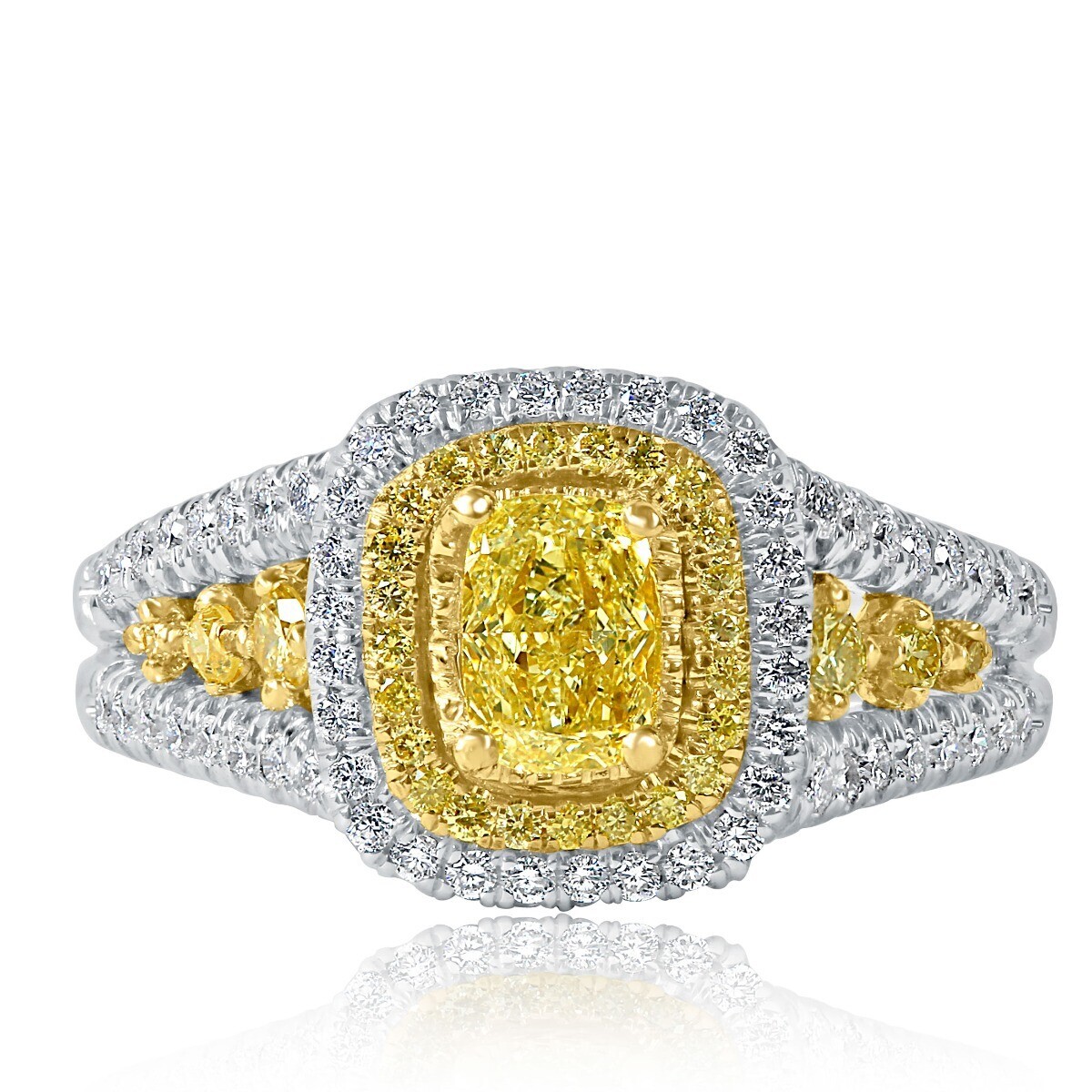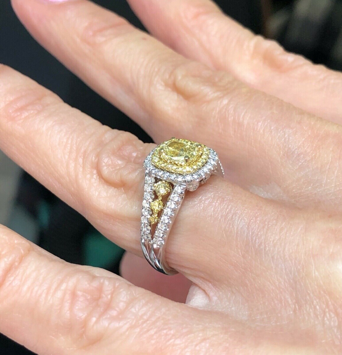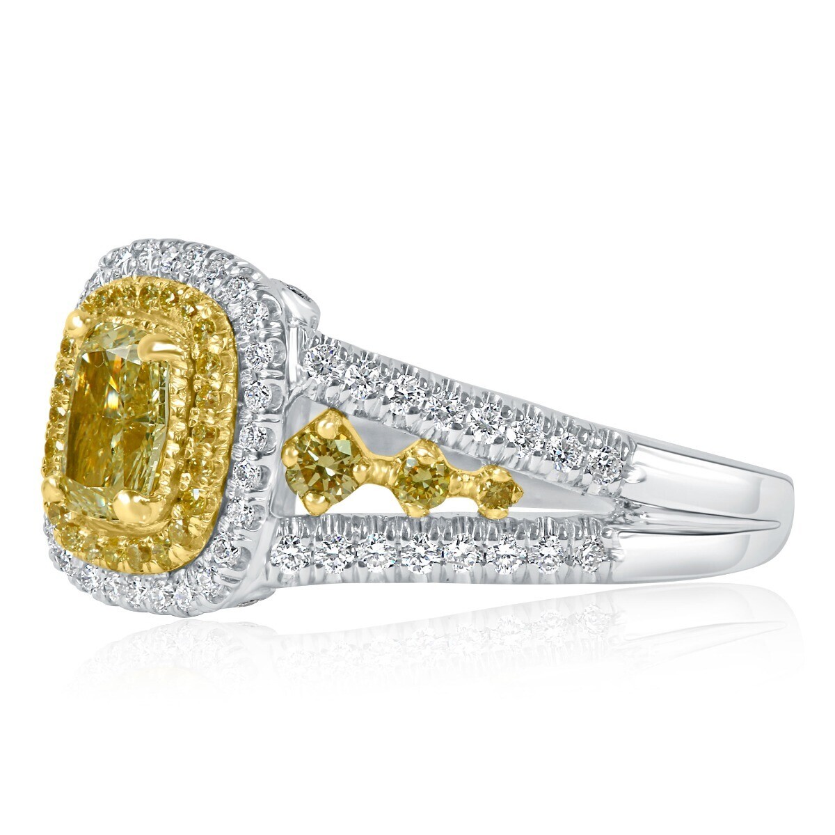 1.27 Ct Cushion Faint Yellow Diamond Engagement Ring Split Shank 14k White Gold