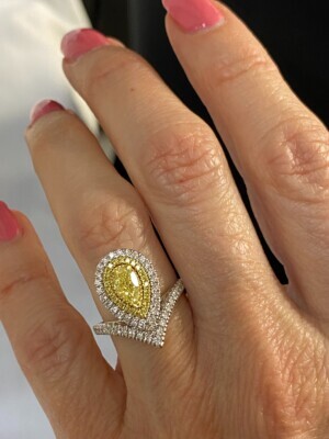 From elegant designer style to timeless classic, this is a luxurious engagement ring will be must have for your future spouse. This lovely diamond engagement ring features a 0.52 carat oval cut natural fancy yellow offset diamond surrounded by a double halo of yellow and colorless round cut diamonds. The additional diamonds line the v-shank adding an extra beauty to the ring. Handcrafted in 14-karat two-tone gold and completed with a high polish finish. The total carat weght is 1.20 carats. Our products are all hand made with quality and care, in the heart of the diamond district on 47th Street in New York City. Our dedication and commitment to fine work and quality exceeds all others. Since all of our products are handmade in the USA, every piece shares the same level of attention to deta
