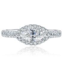 This unique east-west ring showcases a horizontal set 0.52 carat marquise cut center natural diamond surrounded by a halo of sparkling colorless round cut diamonds in micro pave setting, while additional diamonds line the ring's shank and the gallery. Handcrafted in 14-karat white gold and completed with a high polish finish. The total carat weight is 1.03 carats.