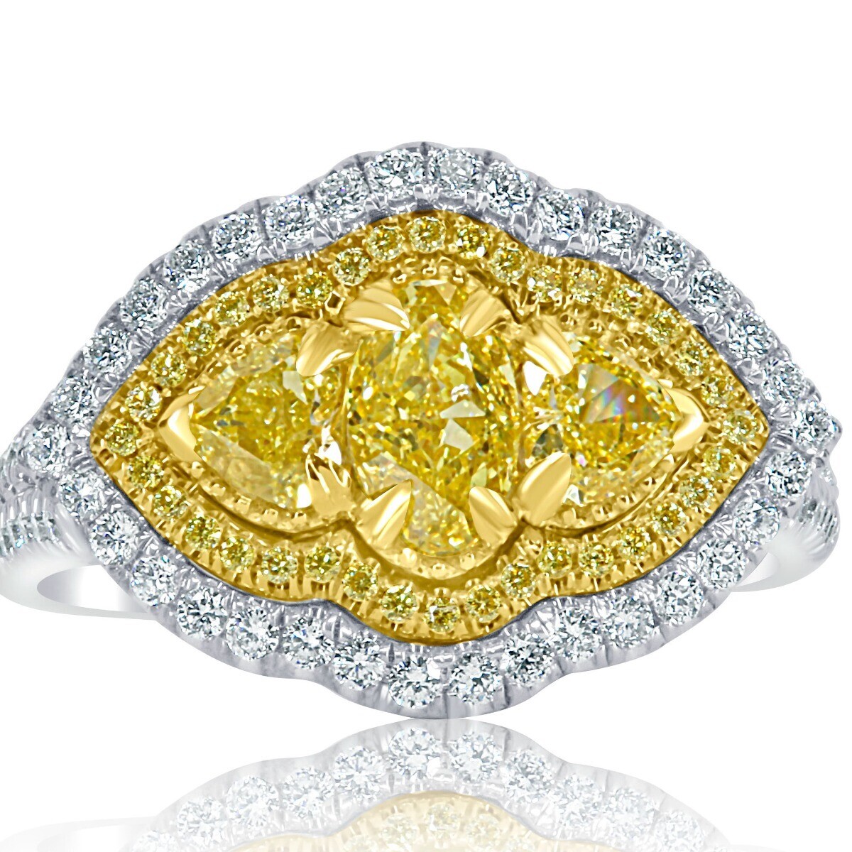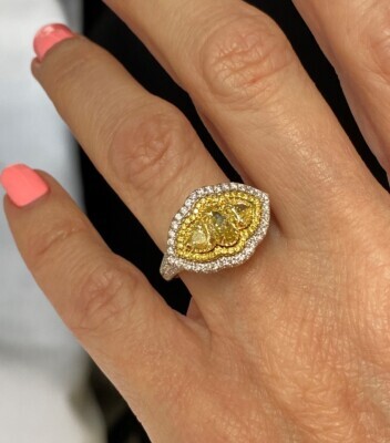 One of the kind engagement ring showcasing a 0.45 carat natural fancy yellow oval brilliant cut center diamond embraced by 2 heart natural fancy yellow side diamonds. The double halo with colorless and yellow round cut diamonds, and a split shank complete a design. Handcrafted in 18-karat multi tone gold. The total carat weight is 1.66 carats.
