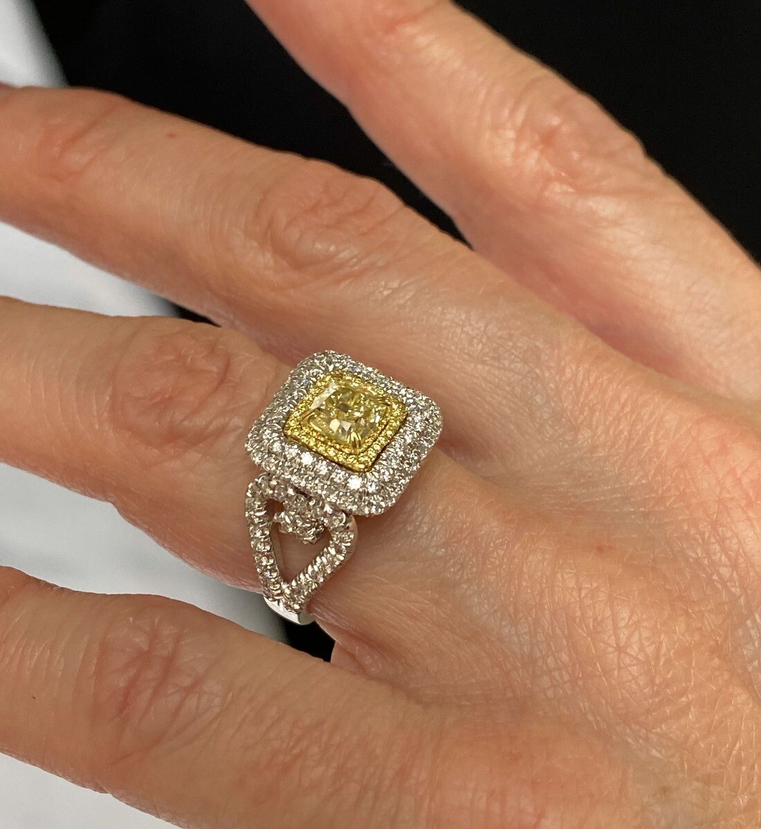 2.23 Ct Cushion Cut Natural Light Yellow Diamond Engagement Ring 18k White Gold