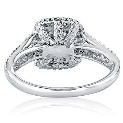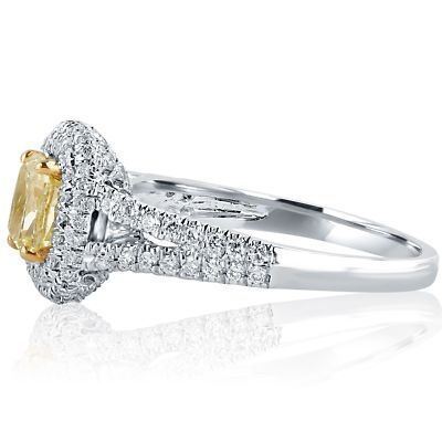 This is a lovely diamond engagement ring that has been detailed to perfection! The center diamond features a cushion cut light yellow stone encircled with a double beautiful halo. The 18k white gold shank is decorated with additional diamonds. The total carat weight is 1.49 carats.