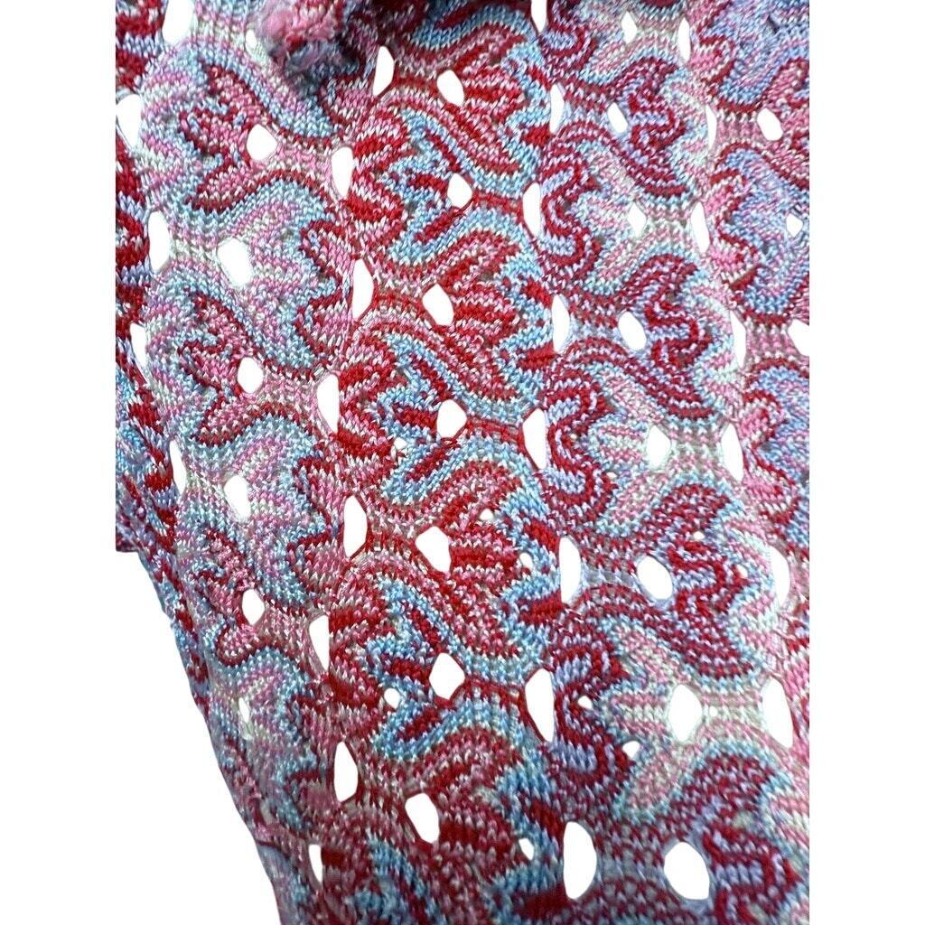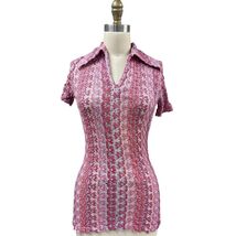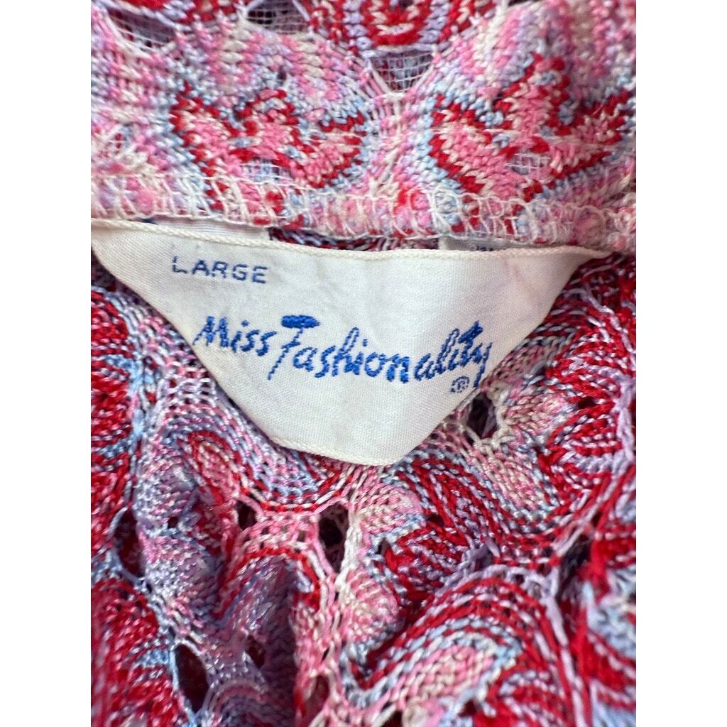 Check out this fabulous VTG 70s Miss Fashionality Short Sleeve Stretch Nylon Top in a vibrant red/pink/blue/purple flame stitch pattern! Featuring a stunningly large 70s-style collar, it?s a size Large and in excellent condition, perfect for adding a groovy touch to your wardrobe.