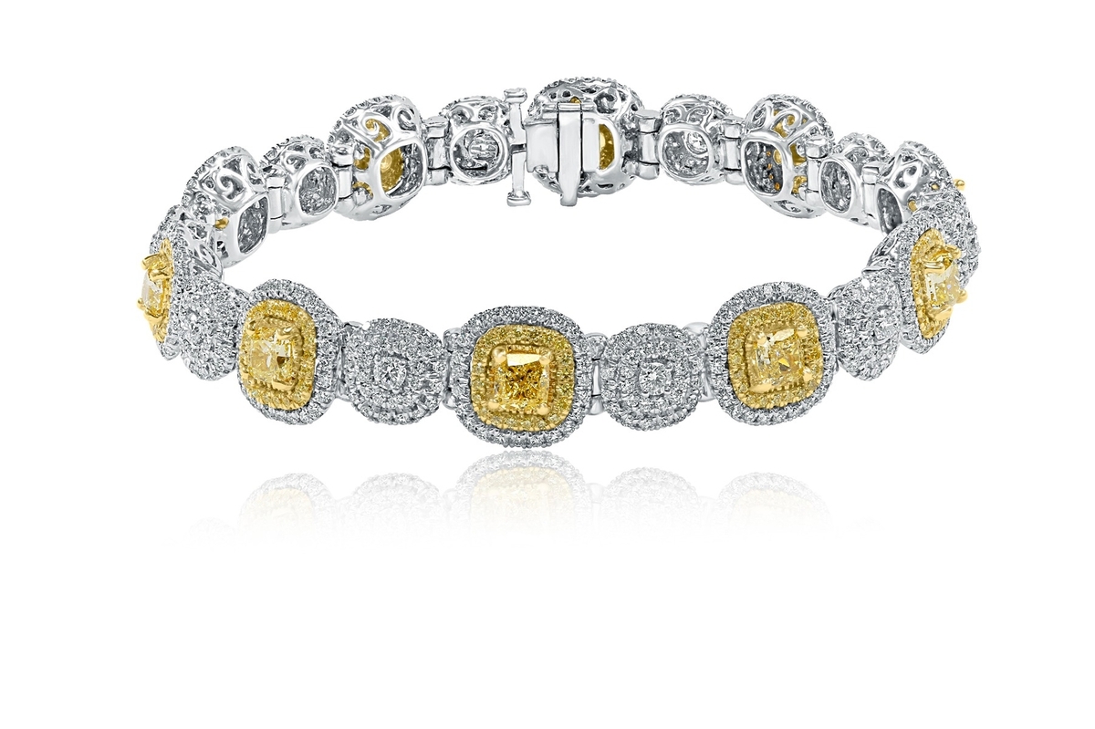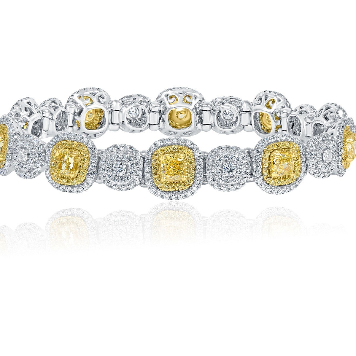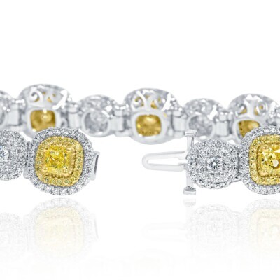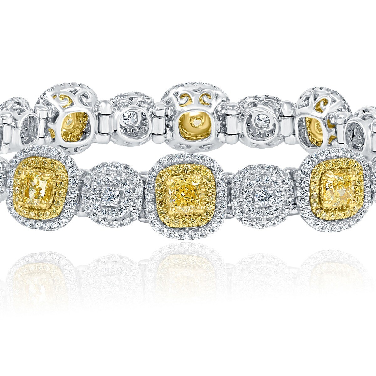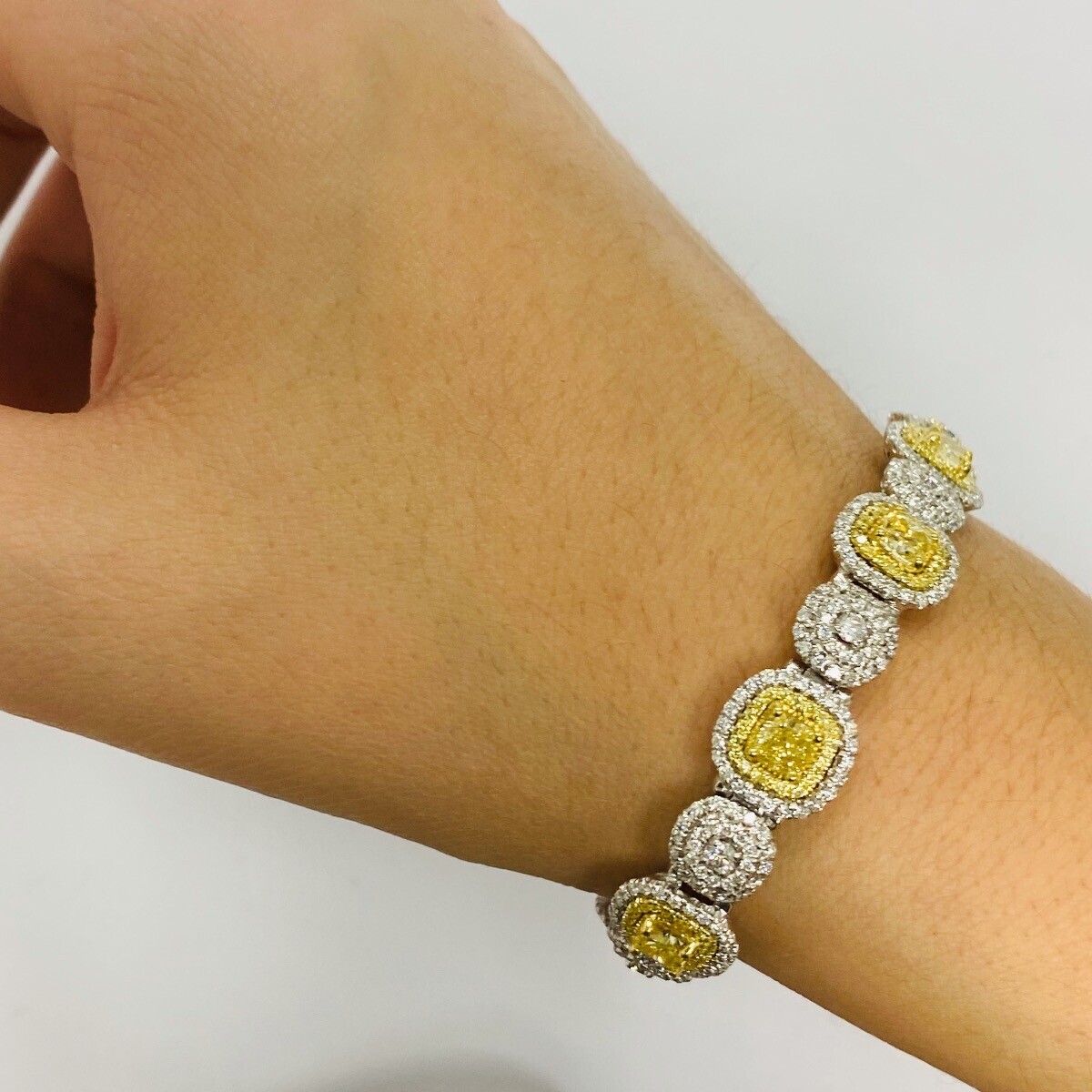 La hermosa pulsera cuenta con 4.13 quilates de diamantes de corte de cojín amarillo claro y claro, 1.11 quilates elegantes amarillo y 3.76 quilates diamantes de corte redondo en una configuracion de oro de 14k tono múltiple. Cada diamante de color amarillo claro cortado de colchon se hace doble halo por diamantes de corte redondo amarillo y blanco y vinculado por un grupo de diamantes blancos espumosos de corte redondo doble de halo en el entorno de pavimento. El peso del brazalete es de 25 gramos y 7 pulgadas de largo. Este brazalete trae un brillo impresionante a cualquier conjunto. Todos nuestros productos estan hechos a mano con calidad y cuidado, en el corazon del Distrito de Diamantes en la calle 47 en la ciudad de Nueva York. Nuestra dedicacion y compromiso con el buen trabajo y la