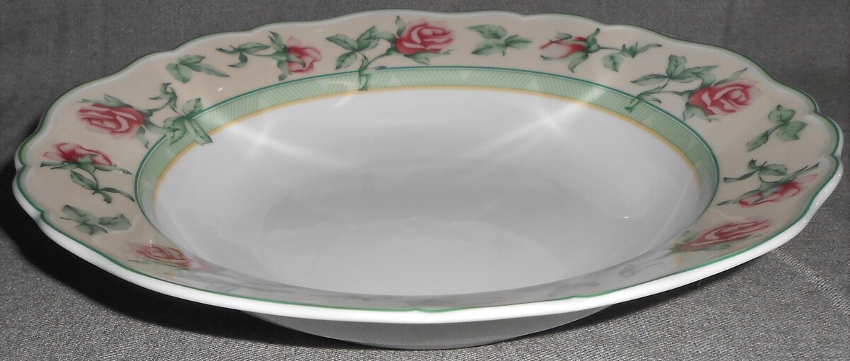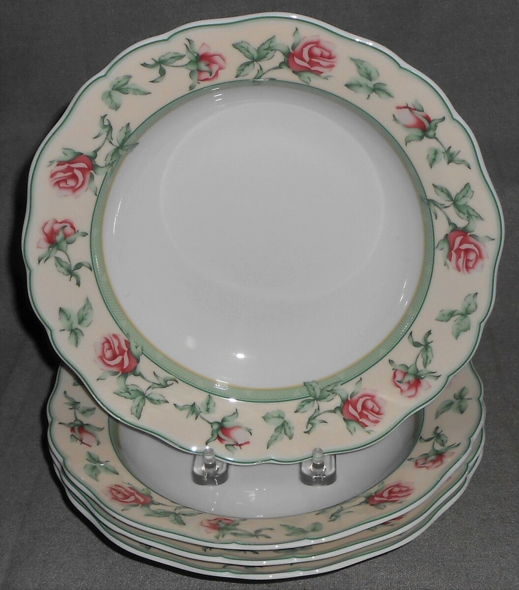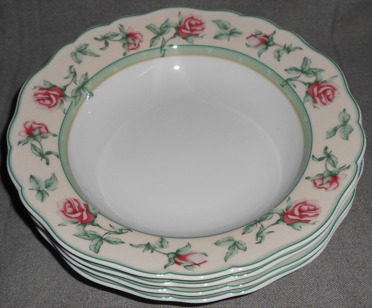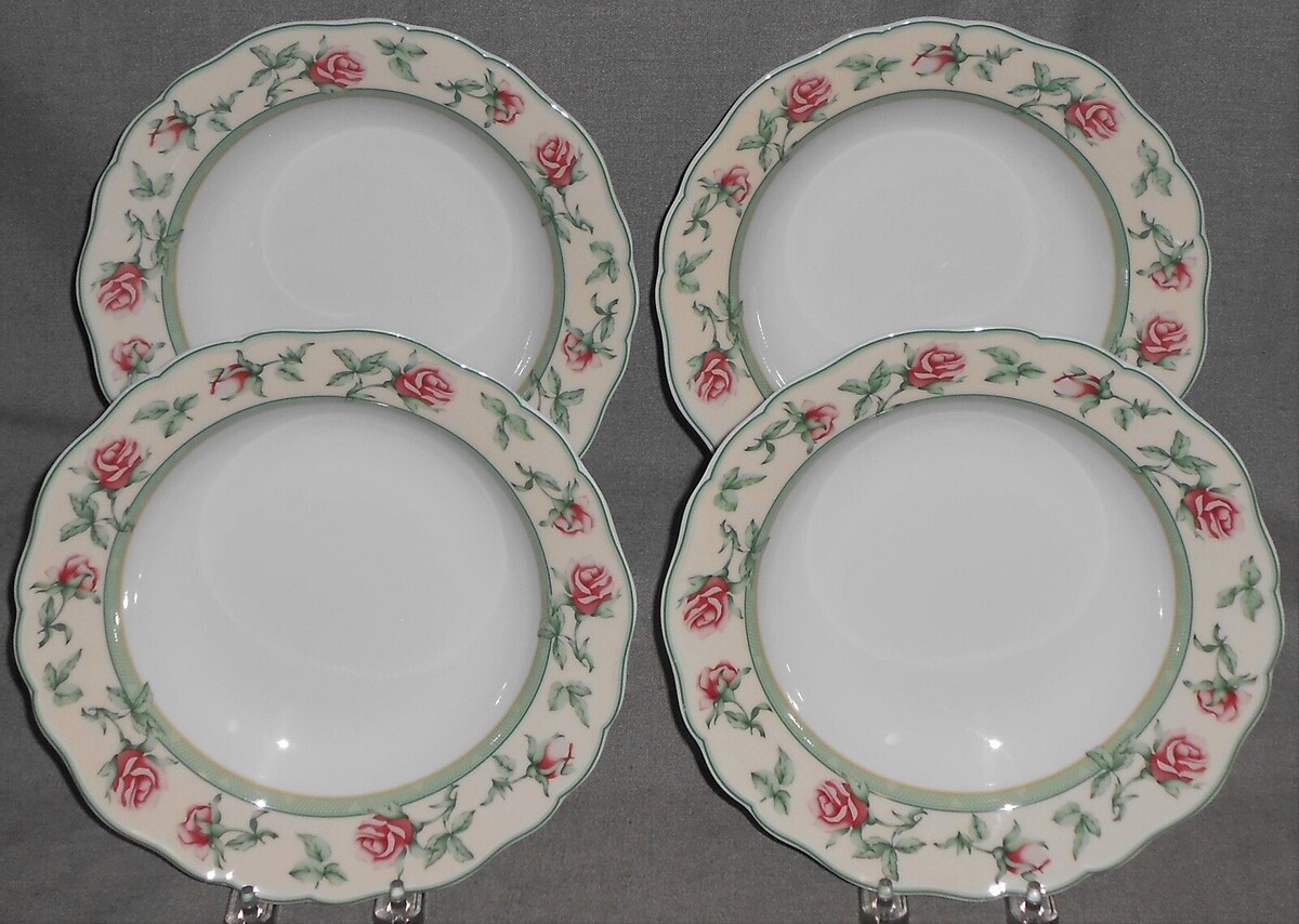 This is a Set of (4) 9" Fine Porcelain Rimmed Soup Bowls from Wedgwood in the English Cottage Rose Collection Pattern and Made in Germany. They are all in good pre-owned condition with no chips or cracks.