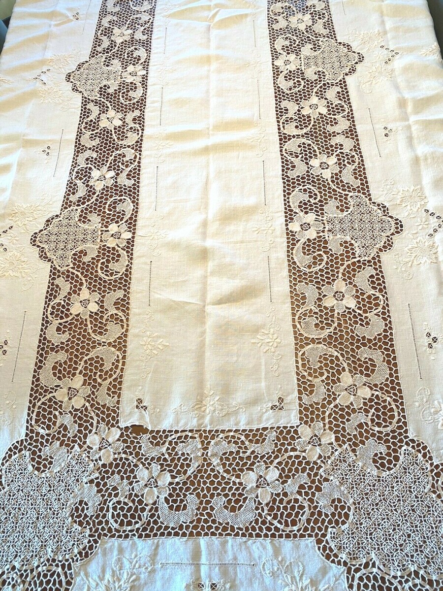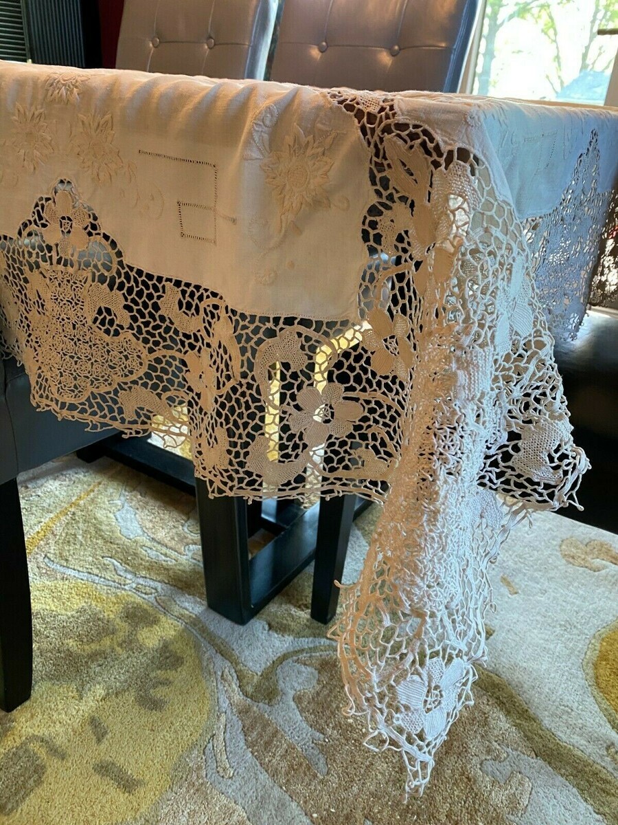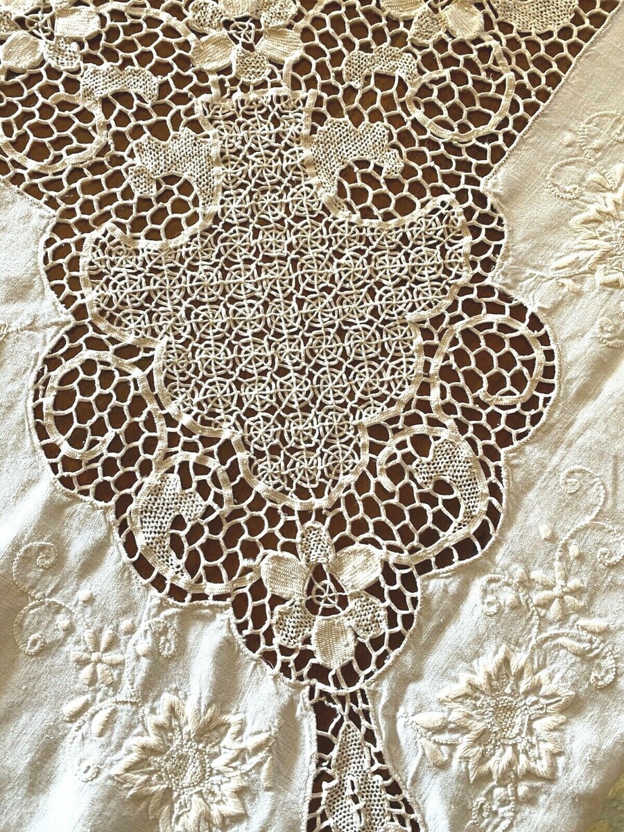 An antique tablecloth with a combination of techniques including an unusual "spiderweb" braided lace, drawn work and embroidery. It is very striking, beautiful and long.