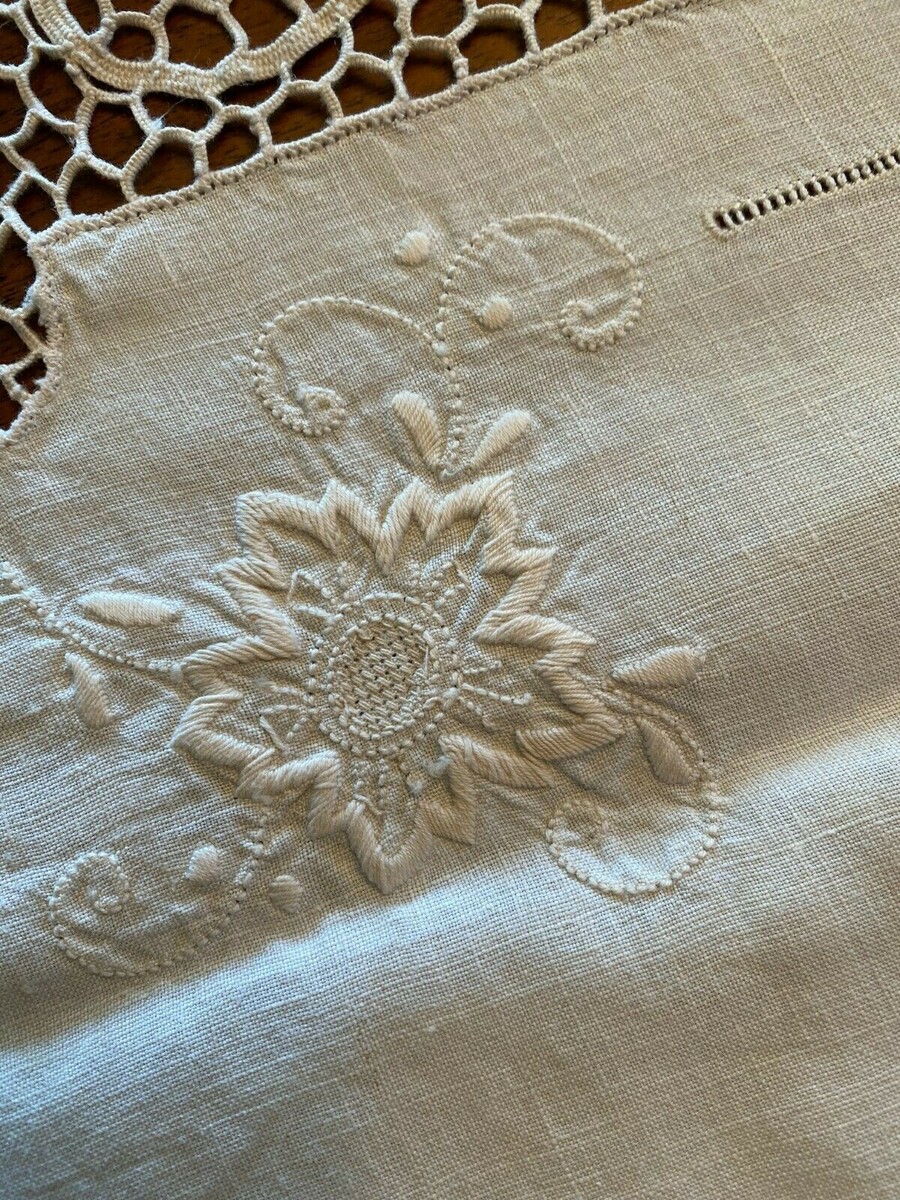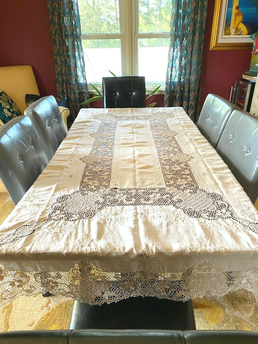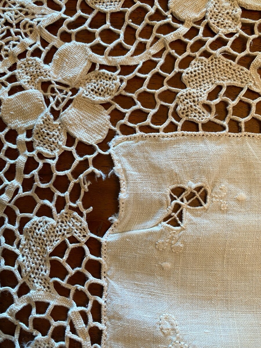An antique tablecloth with a combination of techniques including an unusual "spiderweb" braided lace, drawn work and embroidery. It is very striking, beautiful and long.