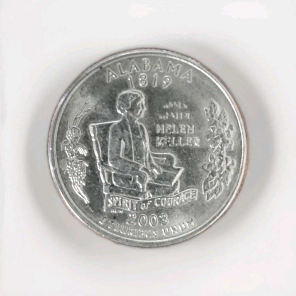 The product is a 2003 P Alabama Statehood Quarter, part of the State Quarters series issued by the United States Mint. This single coin features the image of Helen Keller on the reverse, commemorating the anniversaries of the signing of the Treaty of Paris in 1783 and the admission of Alabama to the Union in 1819. The coin is uncirculated and comes from the Philadelphia Mint, making it a valuable addition to any coin collection. With free shipping included, this coin offers a convenient and affordable way to own a piece of American history.