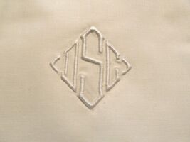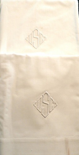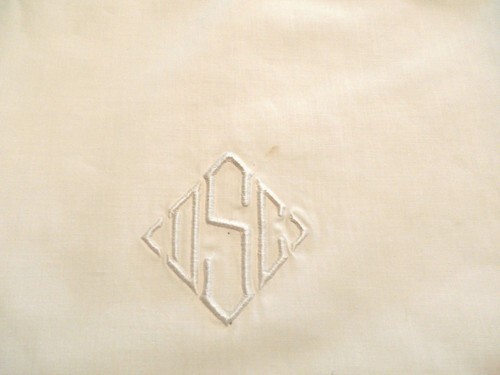 1 twin flat Percale sheet, with a monogram "S", with two letters I can't make out on either side. A tag from Fruit of the Loom is on the bottom. It has a line of faggotting on the top hem.