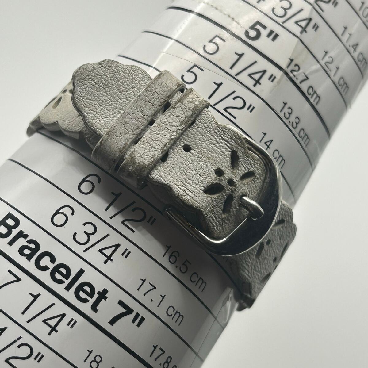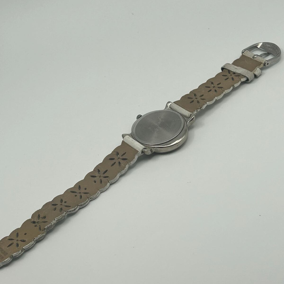 The watch features a sleek silver-tone finish with a contrasting white leather band. The watch has a new battery so it's ready to wear and enjoy.