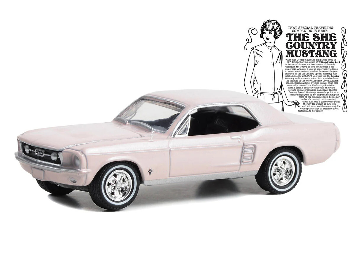 Brand new 1/64 scale diecast model of the 1967 Ford Mustang Coupe in Bermuda Sand, part of the GreenLight "Hobby Exclusive" Series. This She Country Special edition honors Bill Goodro Ford in Denver, Colorado and is presented as a Limited Edition collectible that stands out in any Mustang lineup.