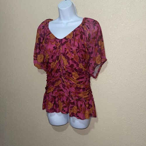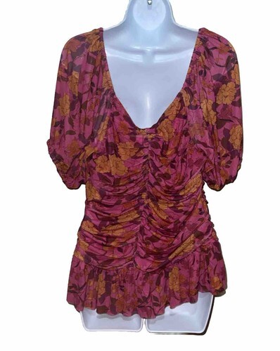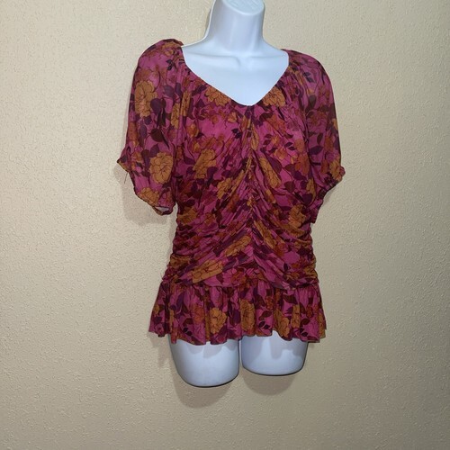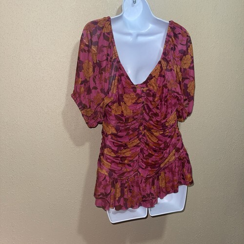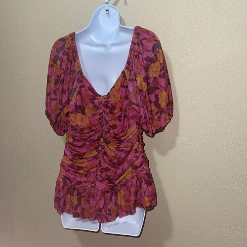 DR2 Pink Purple Floral Puff Sleeve Peplum Blouse Women?s Size XL NEW