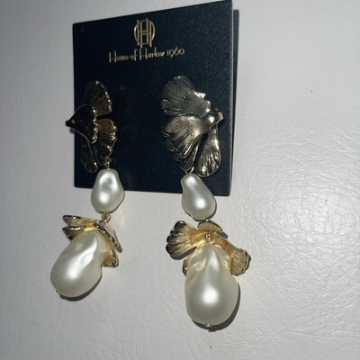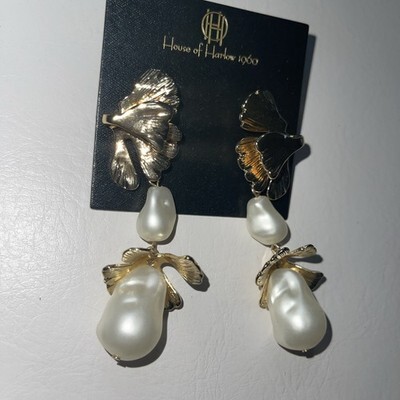 House Of Harlow 1960 Gold Tone Leaf Faux Pearl Dangle Drop Earrings New
