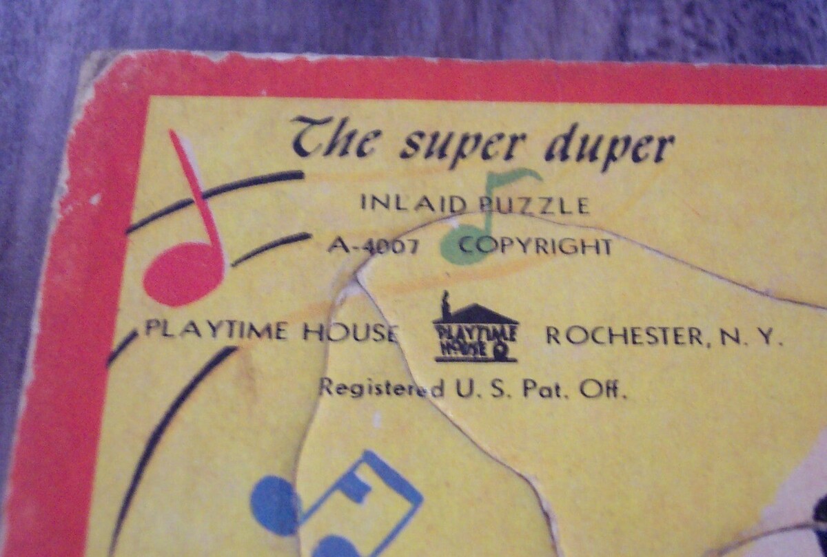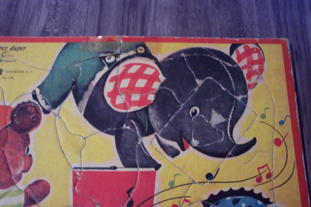 This is a Antique 1950's CIRCUS ANIMALS Playtime House The Super Duper Inlaid Children's Frame Tray PUZZLE A-4007. Overall for its age it is in good condition. It is complete with all the pieces. It does have some wear here and there from use. Has some clear tape on it at spots. It is 10 1/2 inches by 11 1/2 inches. Made by Playtime House in Rochester NY. It has 28 Pieces. EAG