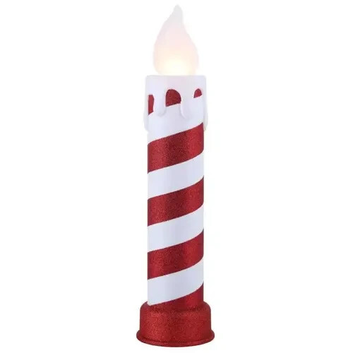 The Mr. Christmas 62299AC is a 24-inch tall blow mold yard decor candle featuring a classic red-and-white striped design with a glittery base and simulated melted wax for a nostalgic holiday look. Illuminated by warm white LEDs with a twinkling effect, it mimics the gentle flicker of a real flame without heat, smoke, or fire risk. Battery operated for cord-free placement, this outdoor-safe candle can be positioned along walkways, on porches, beside entry doors, or indoors by fireplaces to enhance seasonal ambiance. Its durable blow-molded plastic construction ensures long-lasting use year after year in typical winter conditions.
