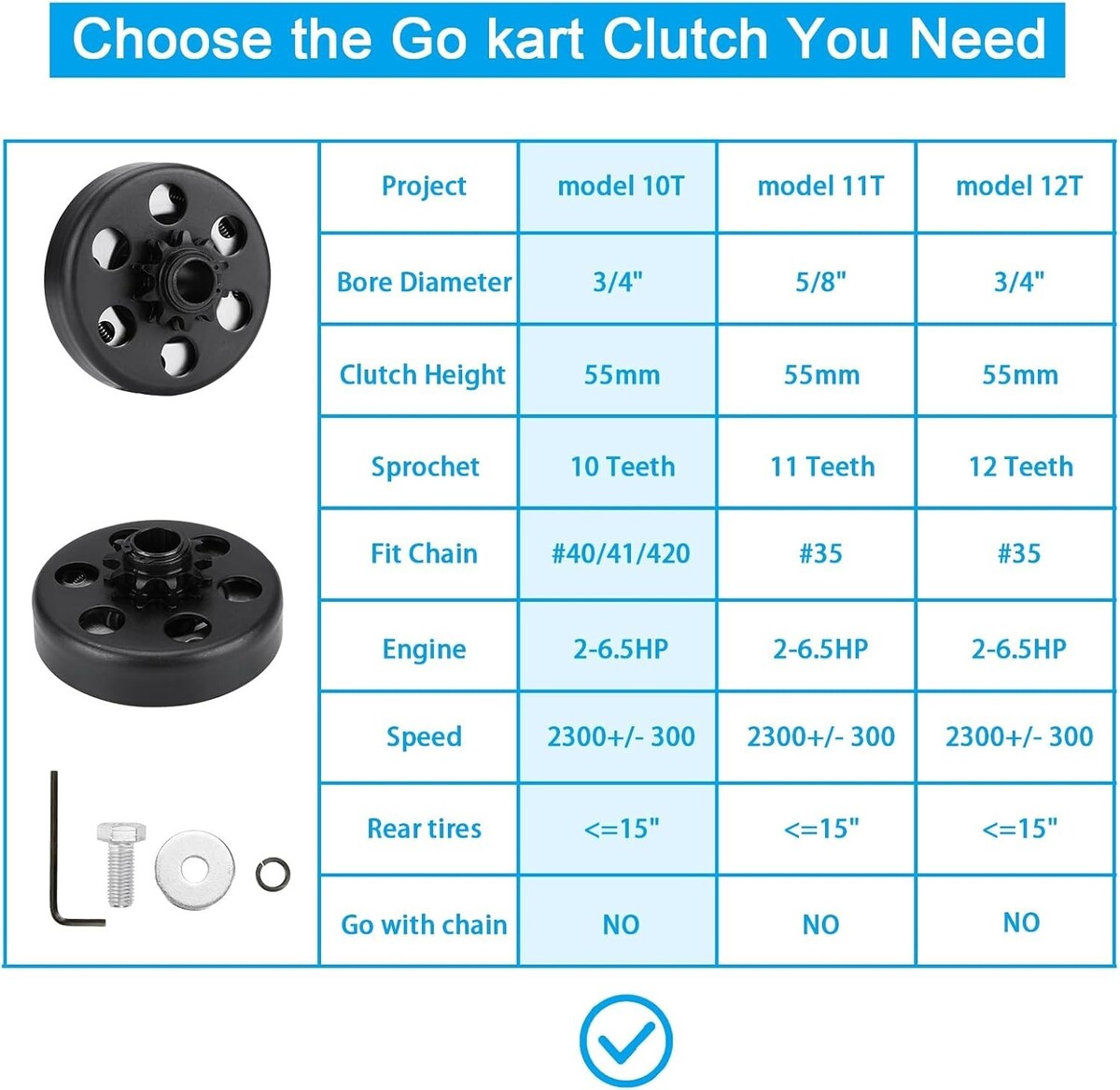 Go Kart Clutch 3/4" Bore 10 Tooth Sprocket for 40/41/420 Chain designed for 2-6.5Hp 212cc Predator engines clutch. Outside diameter: 4 3/4"; Total width: 3"; Clutch back to sprocket: 2 1/2". (Chain Not included).