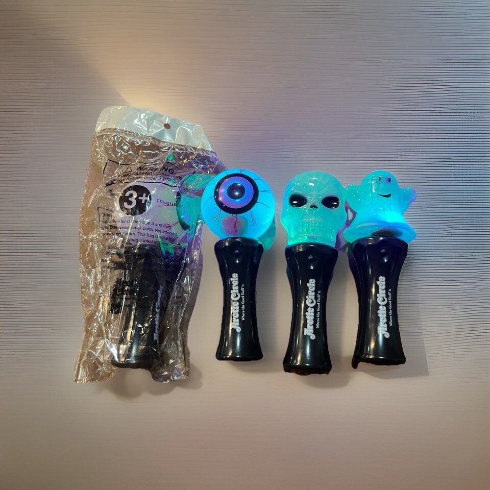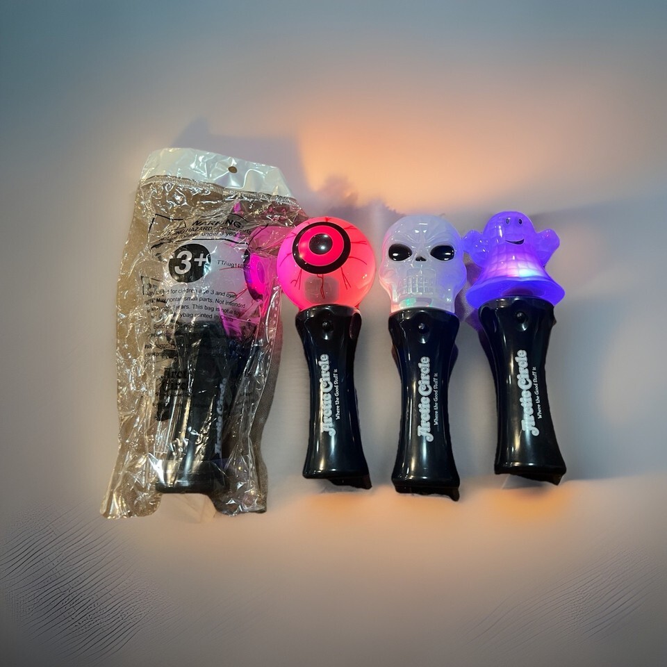 This lot includes vintage Arctic Circle Halloween toy flashlights featuring spooky designs like skulls, ghosts, and eyes. These collectible toys are sure to bring a touch of nostalgia and whimsy to your Halloween festivities or toy collection. Perfect for adding a retro charm to your fast food premiums or toys and hobbies collection, these flashlights are a fun and unique way to celebrate the Halloween season.3 opened 1 sealed
