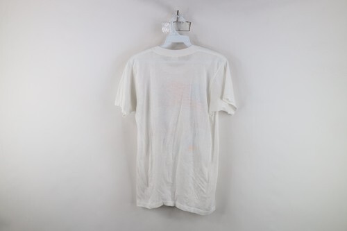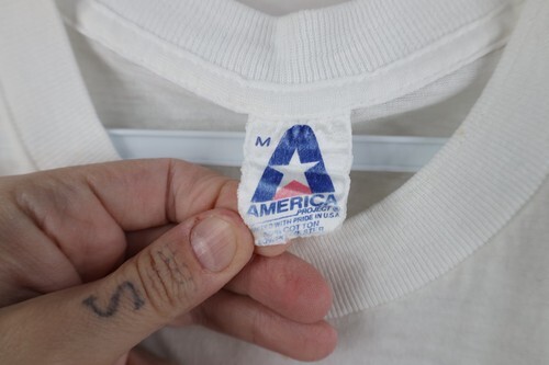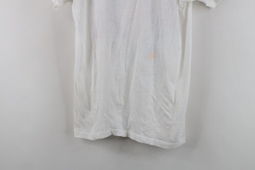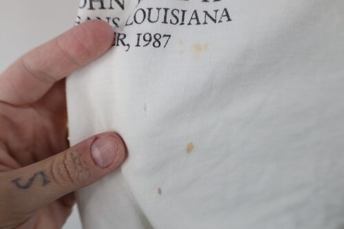 Stains throughout, and collar, arms. Hole front. Collar, arms discolored. Yellowed. Thin material. Graphics faded. Pilling. Made in USA