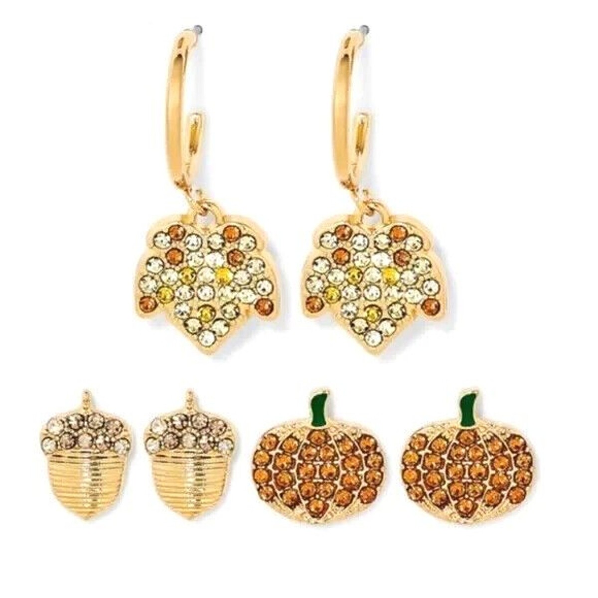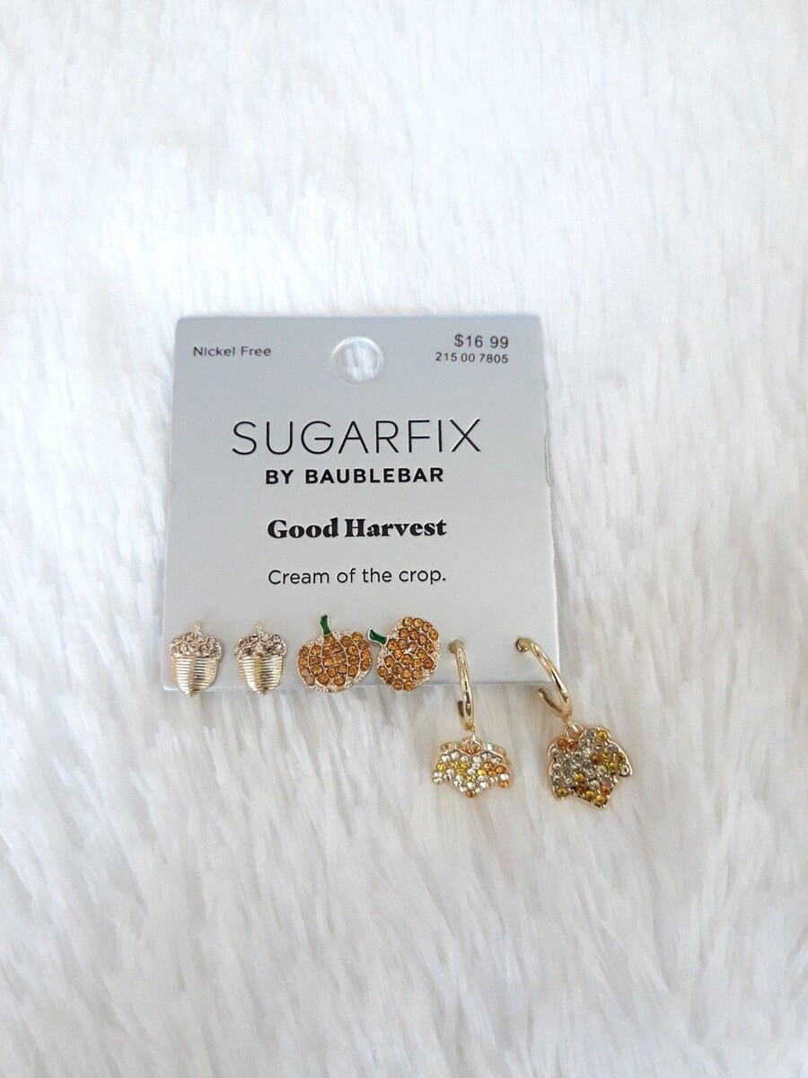 SUGAR FIX Good Harvest Cream of the Crop ~ 3 Pair Earring Set ~ NEW!!! Celebrate the fall season with the SUGARFIX by BaubleBar Fall Harvest Earrings. This triple earring set features an assortment of fall-themed motifs, including an acorn, a pumpkin, and a leaf. These are sure to make everyone smile. Wear with all of your everyday outfits this season and be prepared for plenty of compliments. Dimensions (Overall): 1.12 Inches (L), .49 Inches (W) Comes with three pairs of earrings Surgical steel posts for durability Post back closures on studs and hinge closure on huggies keep earrings comfortably in place Earrings are lightweight for easy, all-day wear Design makes earrings wearable for day or evening Earrings are nickel-free for sensitive ears