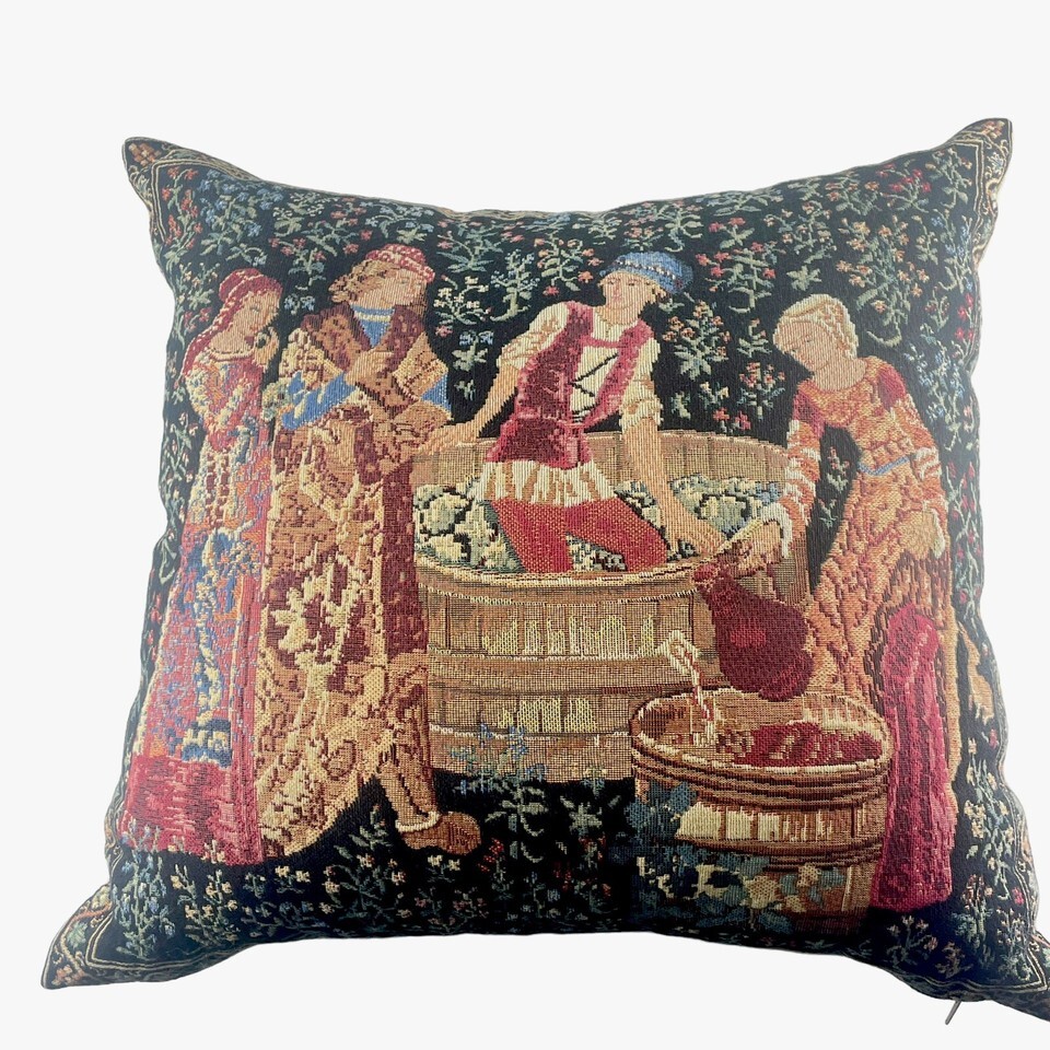 Belgian Tapestry Pillow The Wine Press III Medieval Grape Harvest 18x18"
