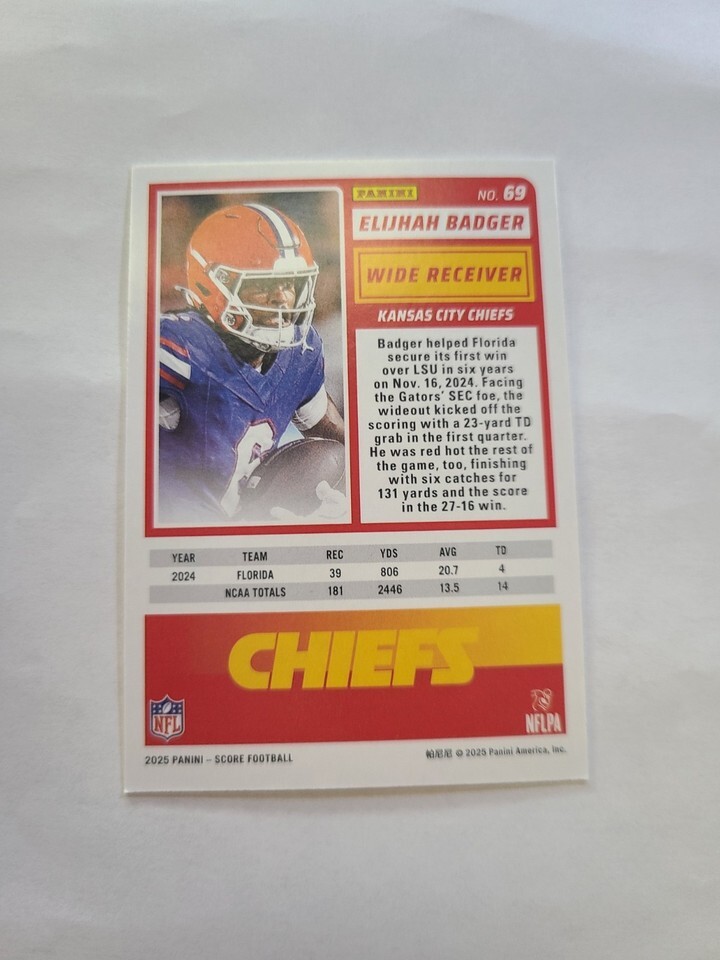 2025 SCORE ELIJHAH BADGER BASE ROOKIE FOOTBALL CARD CHIEFS NFL 69 panini