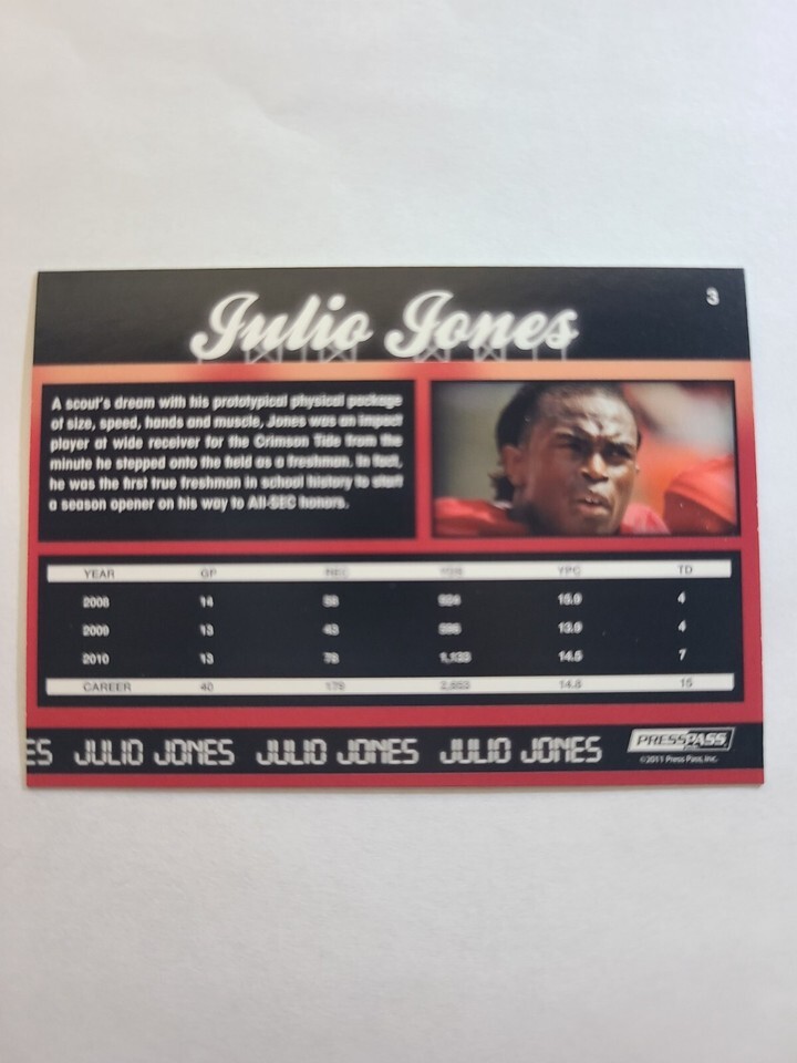 2011 Press Pass #3 Julio Jones Alabama Crimson Tide Atlanta Falcon Football Card. Condition is Ungraded. Shipped with Standard Envelope for eligible items up to $20.