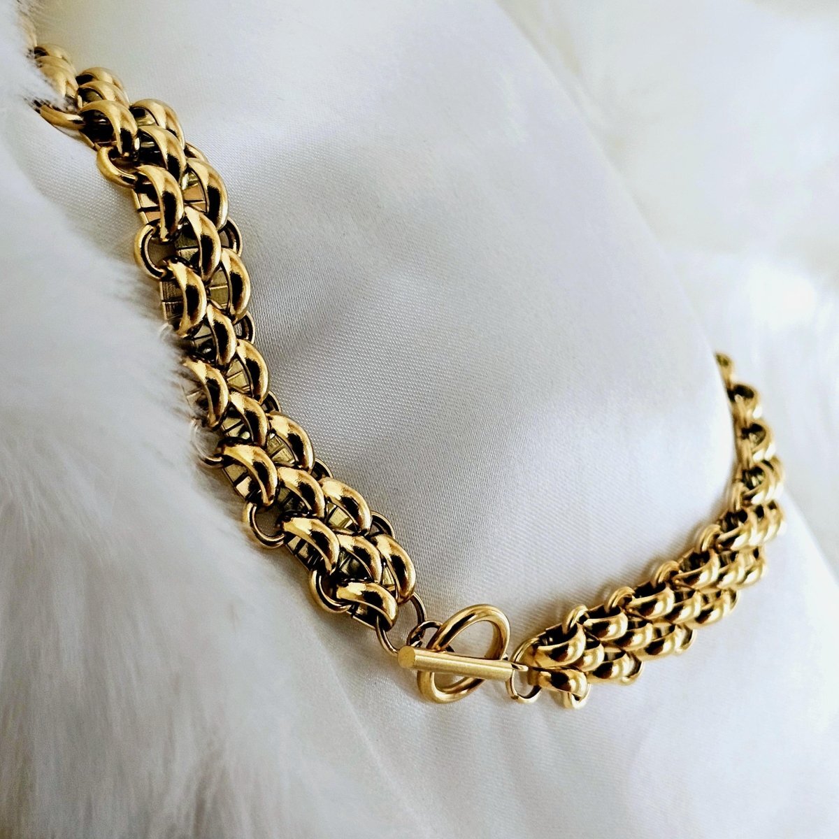 Elevate your style with this bold and elegant statement piece! Featuring a meticulously crafted double-link chain design, this set is plated in 18k gold, giving it a rich and luxurious sheen. The interlocking rounded links add dimension and texture, making it the perfect accessory for any occasion?whether layered with other chains or worn solo for a sophisticated look. Finished with an adjustable lobster clasp, this versatile set ensures a secure and comfortable fit. ITEM DETAILS: Double-link chain for added depth and elegance 18k Gold on Titanium steel Necklace Chain Length: 42 cm with a Toggle bar fastening Width of chain: 1 .3 cm Bracelet Chain Length: 16.5 cm Water-Resistant Tarnish free