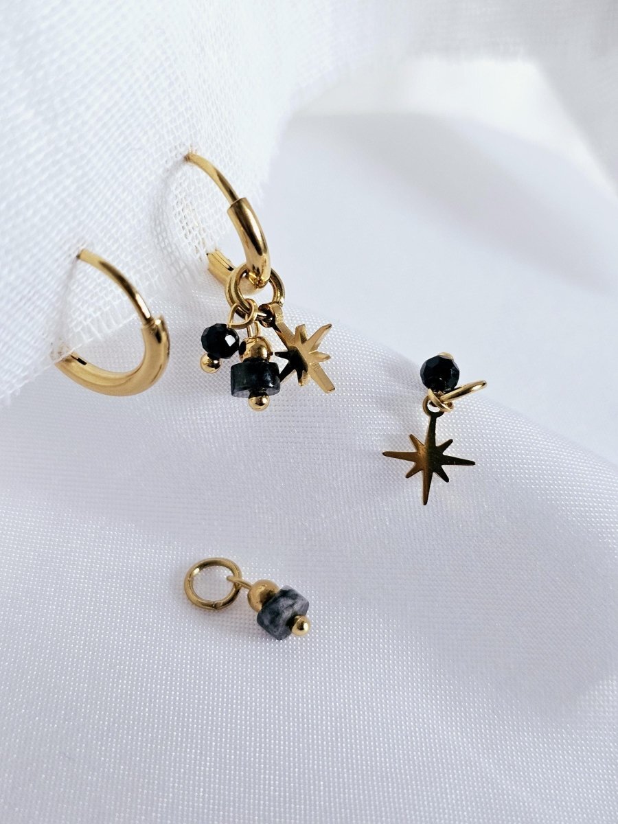 Simply and pretty 18K gold Hoops with natural stone drops.These charms are easily detachable and have enough width to slip through widest of necklace chains and bracelets to experiment with your other lovely pieces in the jewellery box. These dangle drops are lightweight and easily wearable, minimalist design makes it effortlessly compatible with any outfit. ITEM DETAILS: 18K Gold plated on stainless steel Removable bead and natural stone charms - Black Labradorite Green Aventurine 1.45cm diameter Hoops weight: 3g 2.15cm overall length Delivered in a LUMINOUS PRETTIES custom eco-packaging