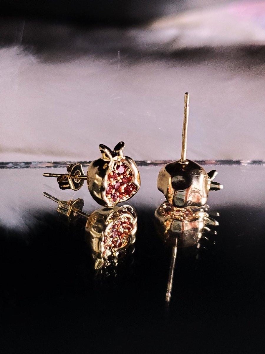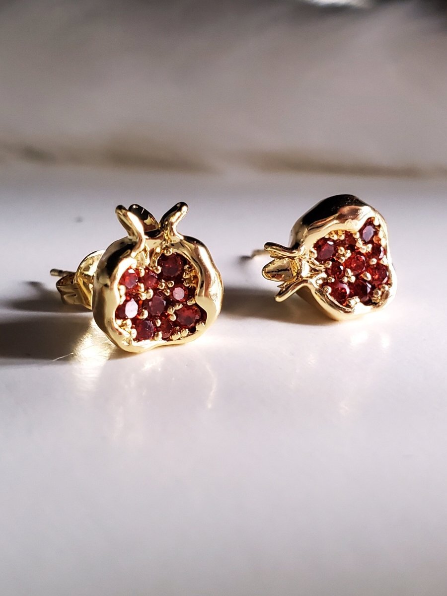 Introducing these exquisite 18k gold-plated pomegranate stud earrings, crafted with premium grade garnet red crystals. These earrings are the perfect blend of playful quirkiness and elegant charm. Their three-dimensional design adds an extra layer of sophistication, making them a standout piece for any occasion. Whether you're dressing up for a special event or adding a touch of fun to your everyday look, these earrings are sure to turn heads and spark conversations. ITEM DETAILS: Garnet Red crystals. 18K Gold plated on Brass Dimensions:10.5 x 10 cm Delivered in a LUMINOUS PRETTIES custom eco-packaging. A polishing cloth is included.