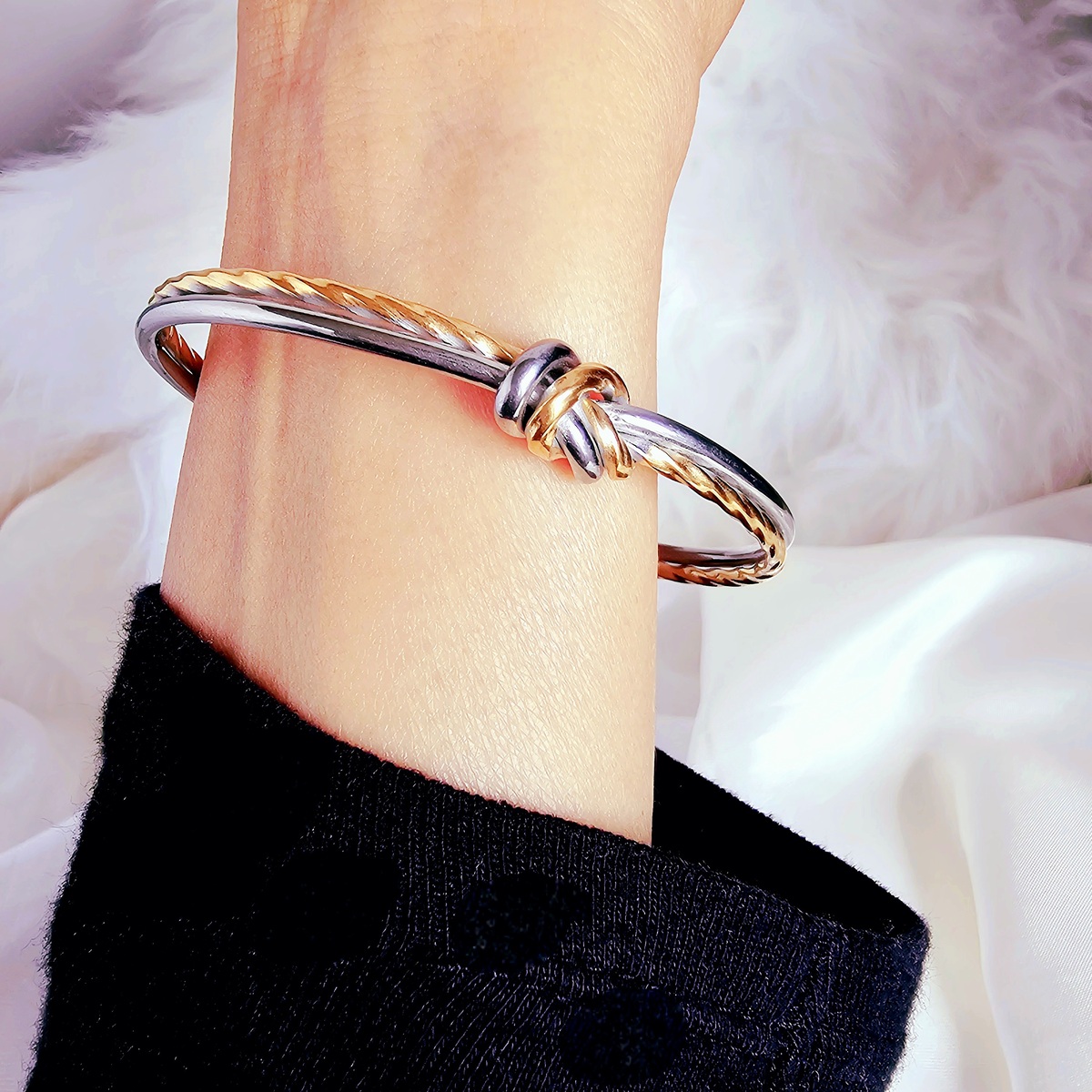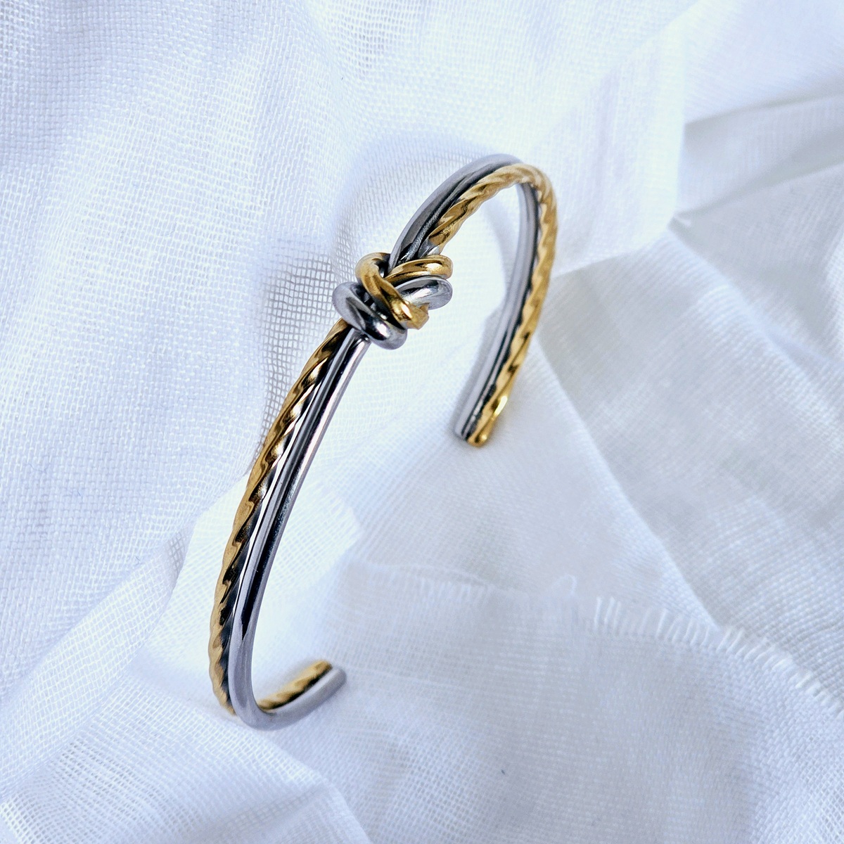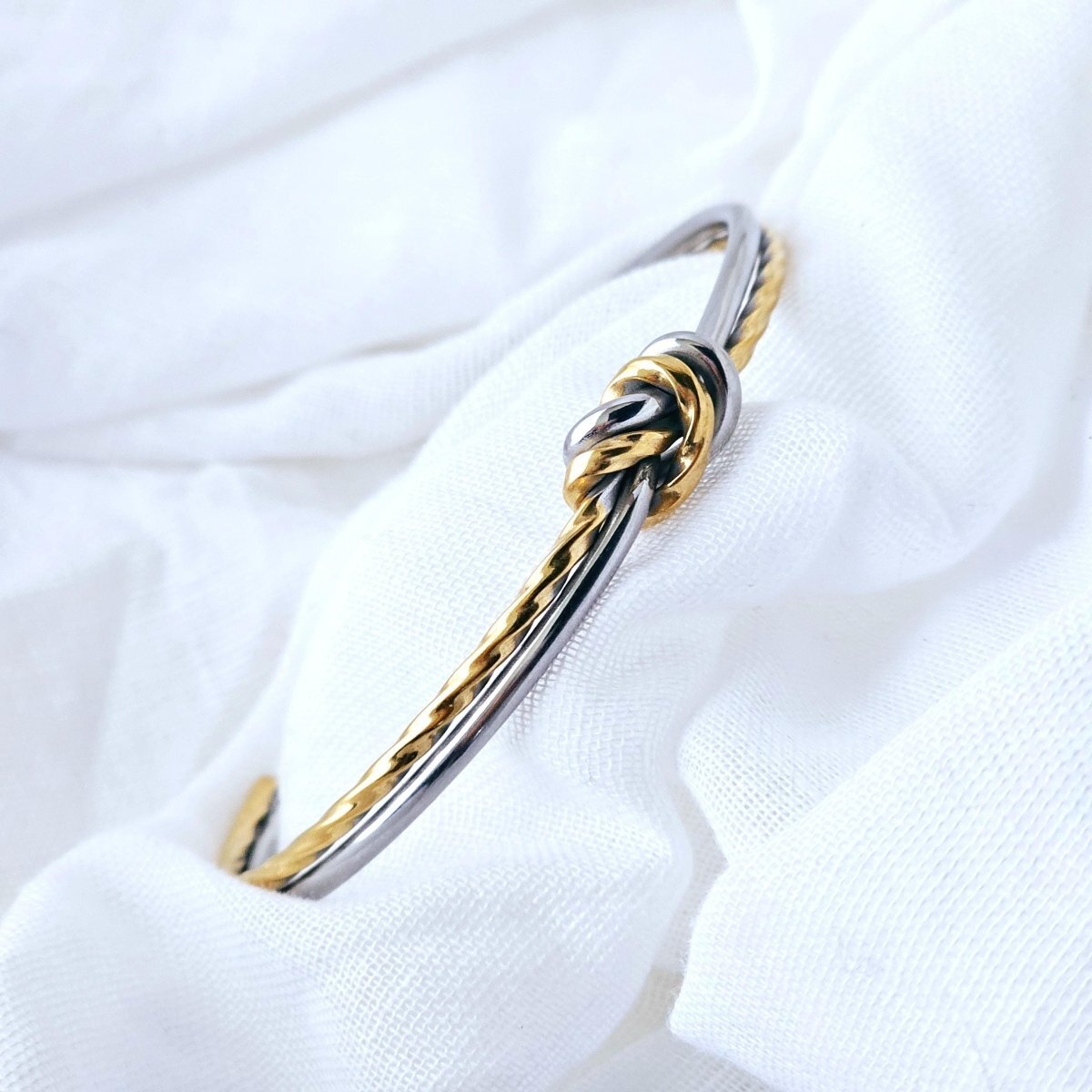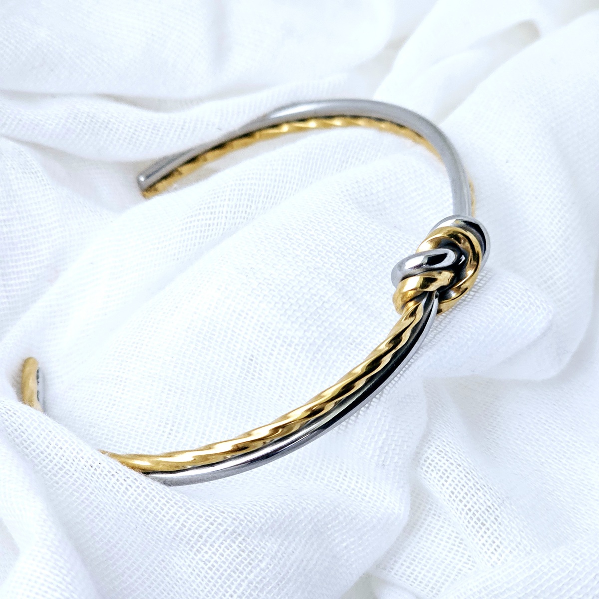 Simple and beautiful knotted Two-tone cuff bangle-bracelet. This gorgeous silver piece is made with love, and is going to add that extra sparkle to your outfit; just slip this open-ended cuff onto your wrist and adjust with a gentle bend to your liking and get loaded with compliments. ITEM DETAILS: Sterling silver plated over Titanium steel 18K Gold Vermeil Tarnish free waterproof sweat proof jewellery that's hypoallergenic 16cm wide, can be adjusted up to 19cm Presented in our signature branded packaging, ready to gift or cherish. 99% Certified Eco-friendly packaging. Gift Wrapping Available